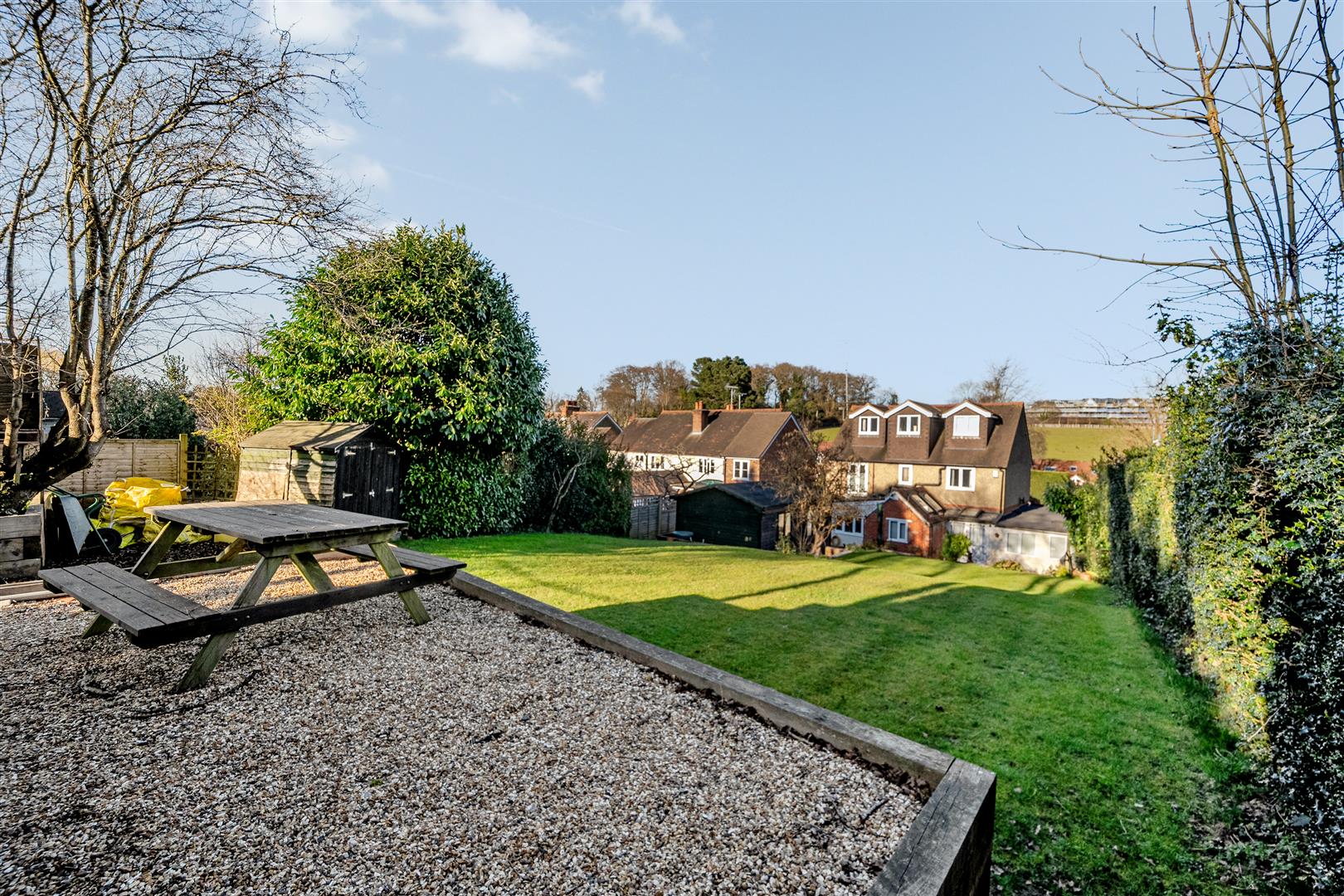 A wide and spacious, 'in and out' gravel drive, bordered by a mature hedge with parking for multiple cars and gated side access to the rear garden.