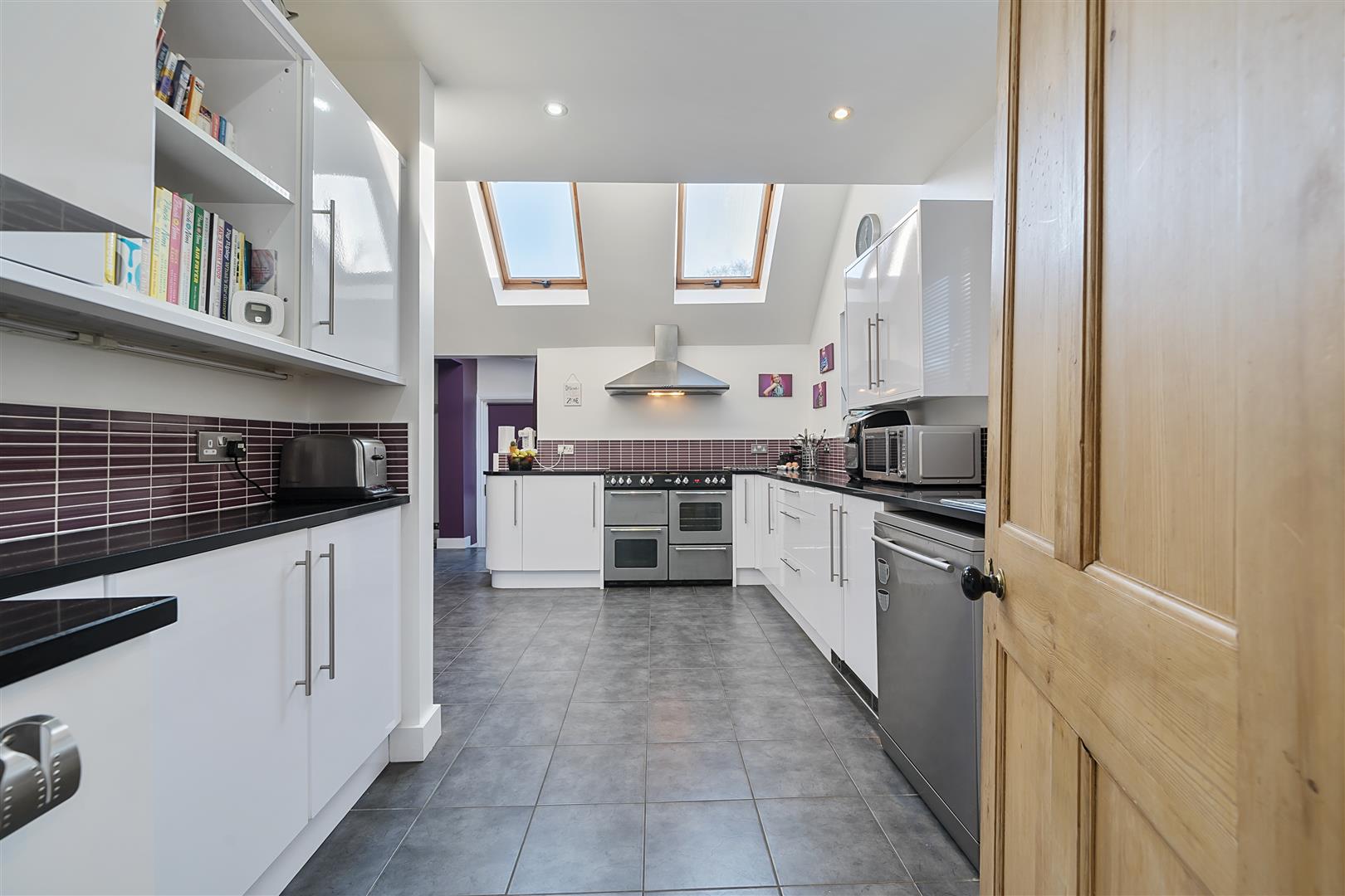 A beautifully fitted and equipped kitchen with plenty of natural light from both the skylights and large windows with views of the garden, tiled floor, ample cupboard storage and work surfaces, range style oven, five ring gas hob, extractor, space for dishwasher and fridge freezer and doors to the utility room and family room.