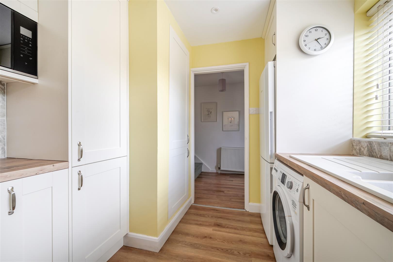 A good sized modern kitchen with ample wall and base units with roll top work surfaces with an inset sink and drainer, four ring hob, extractor and oven. Recess for the washing machine and fridge freezer. Tiled splash backs and a double glazed window to the front.