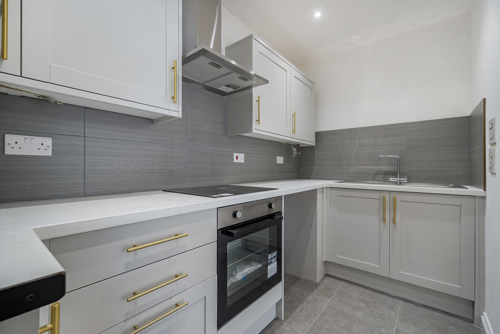 The property is entered through an inviting hallway featuring a storage cupboard, which leads to the family bathroom, an open-plan living room, and a well-appointed and refitted kitchen. Both double bedrooms include built-in wardrobes, with the primary bedroom further enhanced by an en-suite shower room.