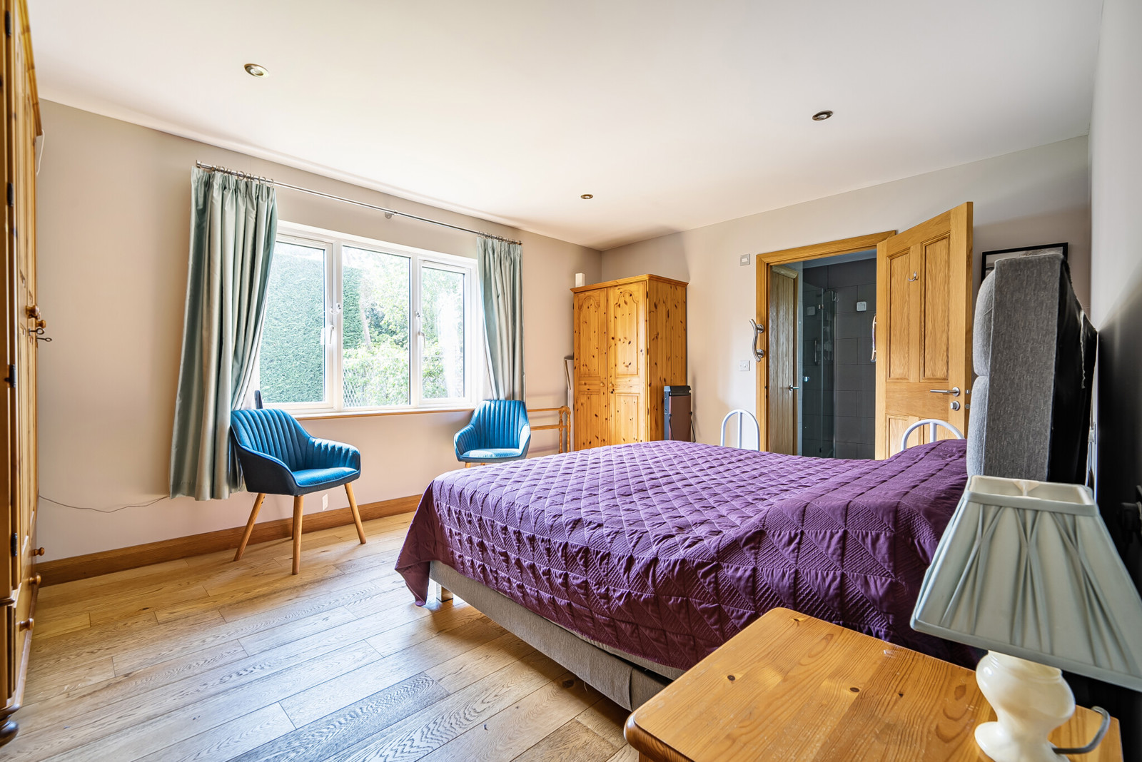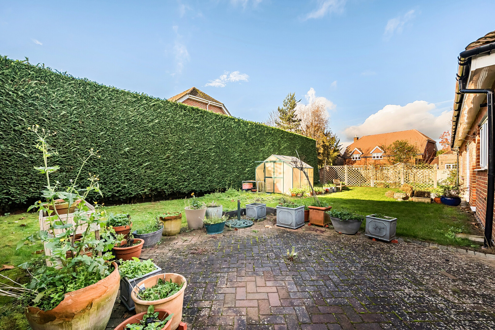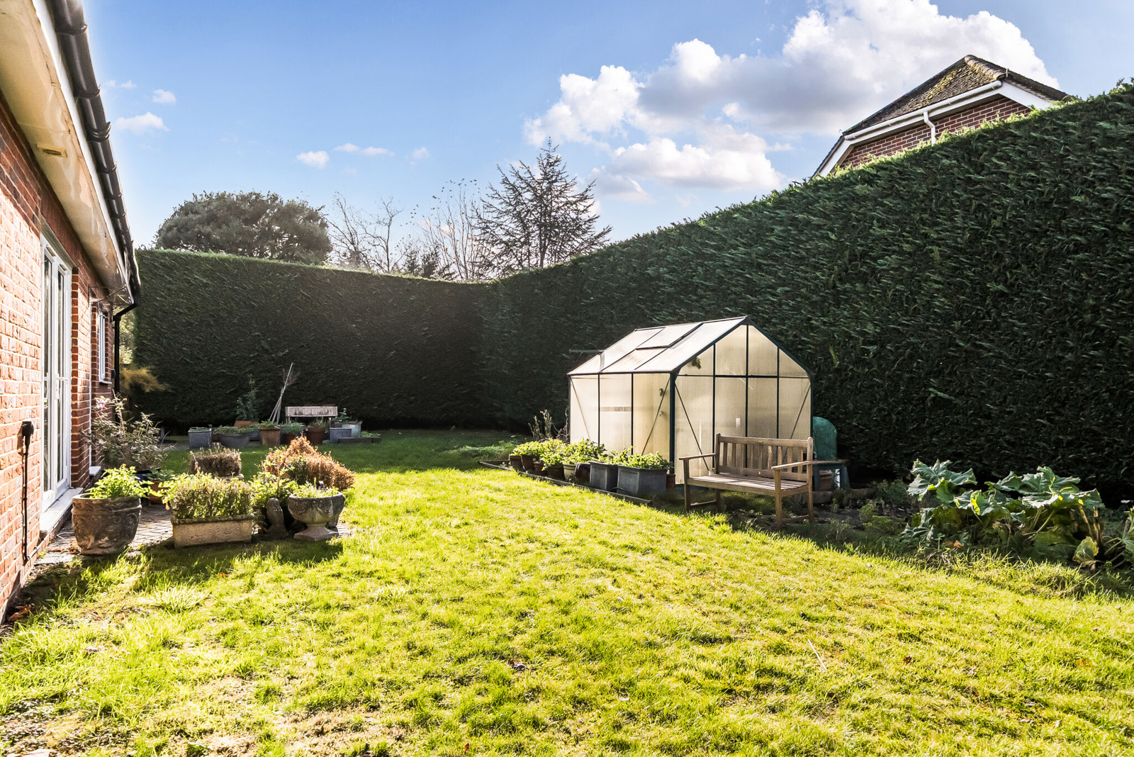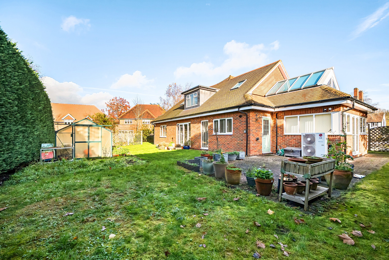 Set back from the road with ample driveway parking and a detached 18ft garage. The professionally landscaped gardens wrap around the home, creating a secluded outdoor space. A generous patio area leads onto a well-maintained lawn, with well-stocked borders. For keen gardeners, there is also a greenhouse and a dedicated vegetable plot, making this a truly versatile and enjoyable garden for all seasons.