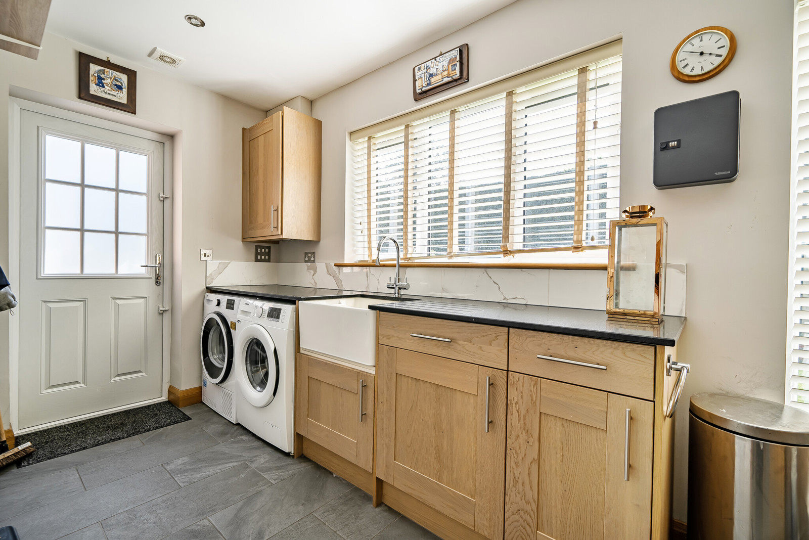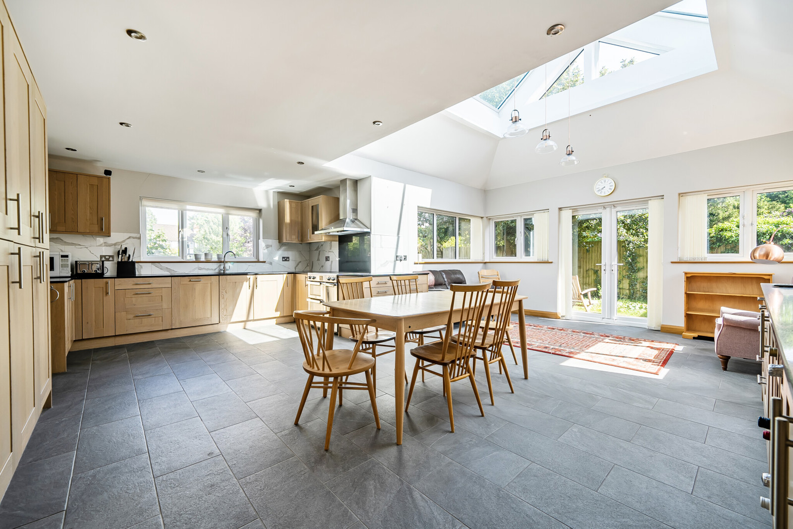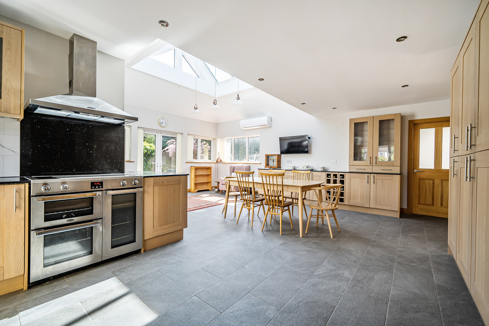 Elegant entrance hall with vaulted ceiling, cloakroom, double doors leading into a 23ft sitting/dining room, family room and a ground floor bedroom with En Suite. The kitchen is a particular feature with granite work surfaces, large roof lantern and French doors leading into the garden. Off the kitchen there is a generous utility. On the first floor there is 20ft principal bedroom with En Suite shower room, a stunning 4 piece bathroom and two further double bedrooms.