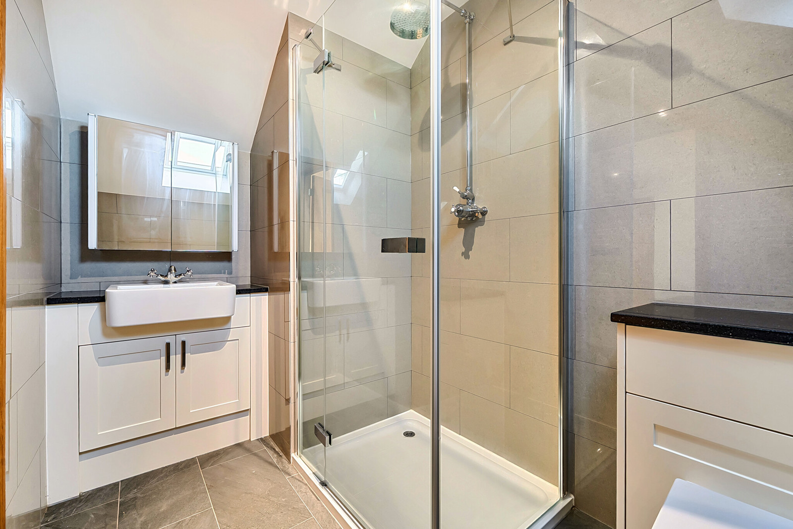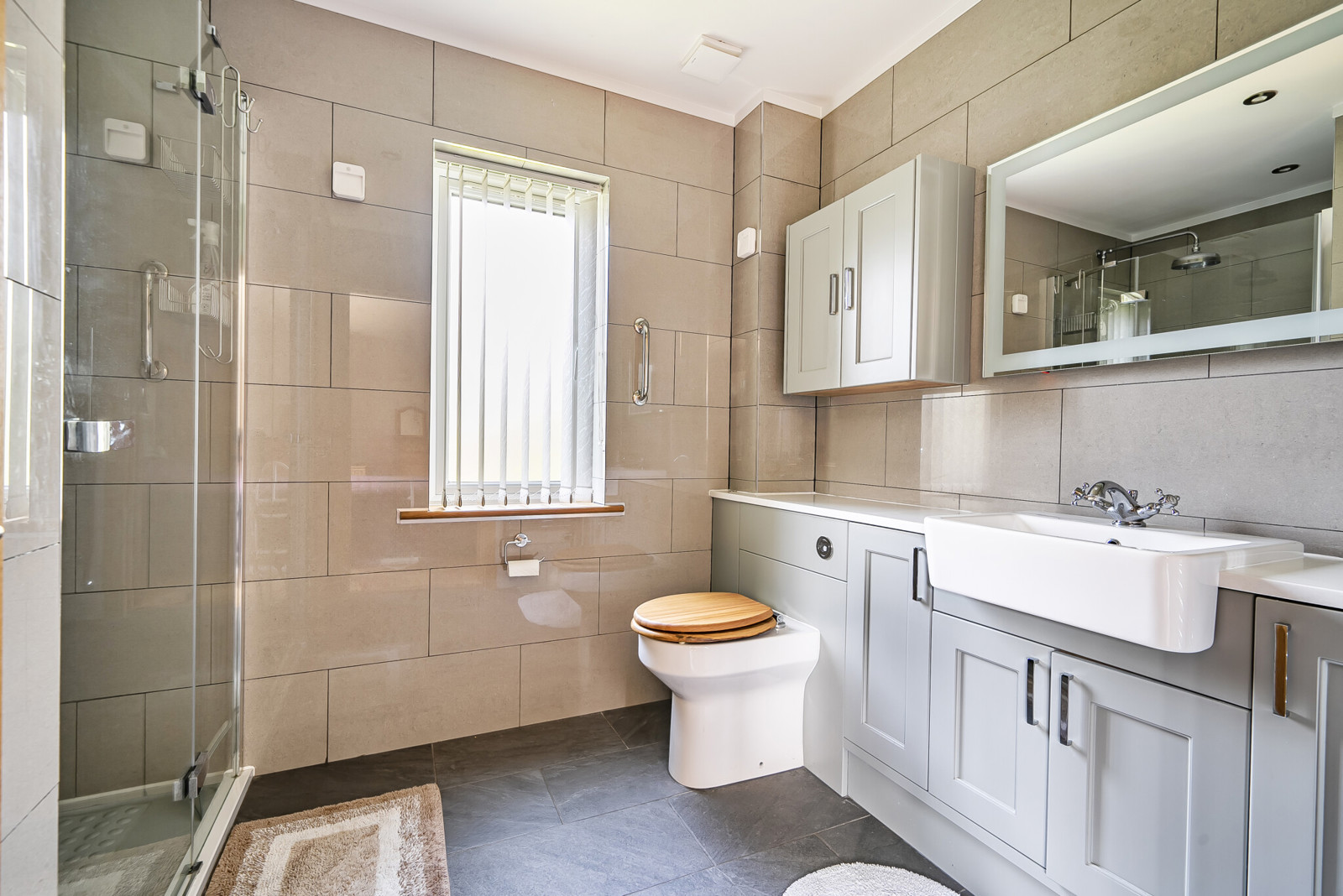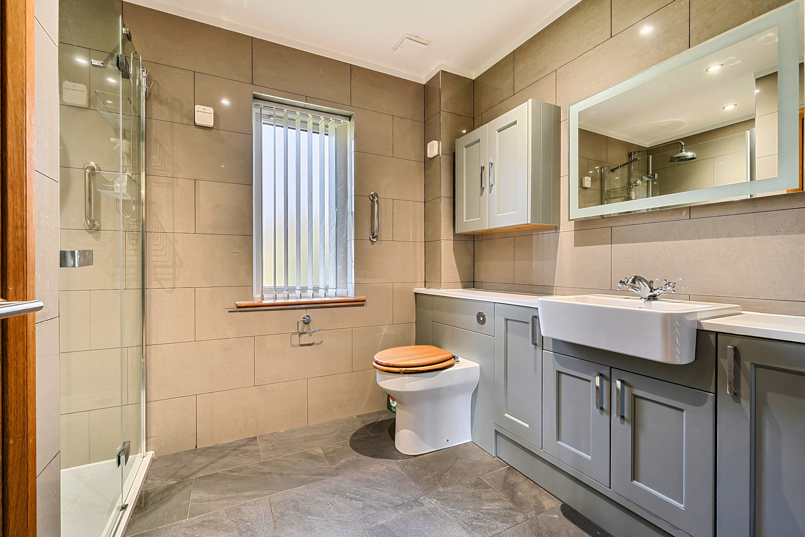 Elegant entrance hall with vaulted ceiling, cloakroom, double doors leading into a 23ft sitting/dining room, family room and a ground floor bedroom with En Suite. The kitchen is a particular feature with granite work surfaces, large roof lantern and French doors leading into the garden. Off the kitchen there is a generous utility. On the first floor there is 20ft principal bedroom with En Suite shower room, a stunning 4 piece bathroom and two further double bedrooms.