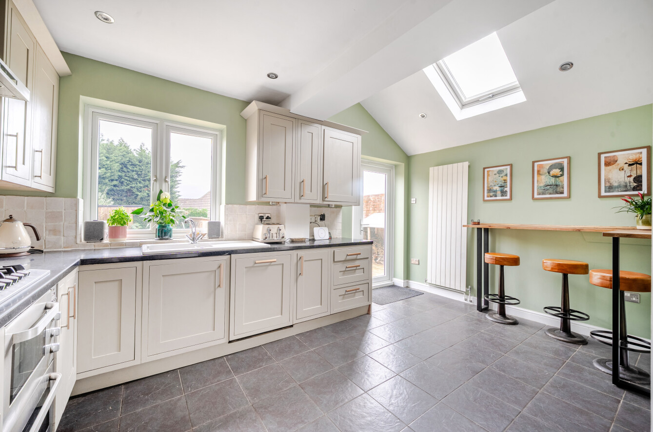 The front reception room exudes warmth and charm, featuring a statement bay window and an elegant fireplace with a log-burning stove, ideal for cosy evenings. Toward the rear, a formal dining room flows seamlessly onto the garden patio, creating an inviting space for summer entertaining. The bright and airy kitchen/breakfast room is enhanced by a large skylight and offers wonderful views across the rear garden.