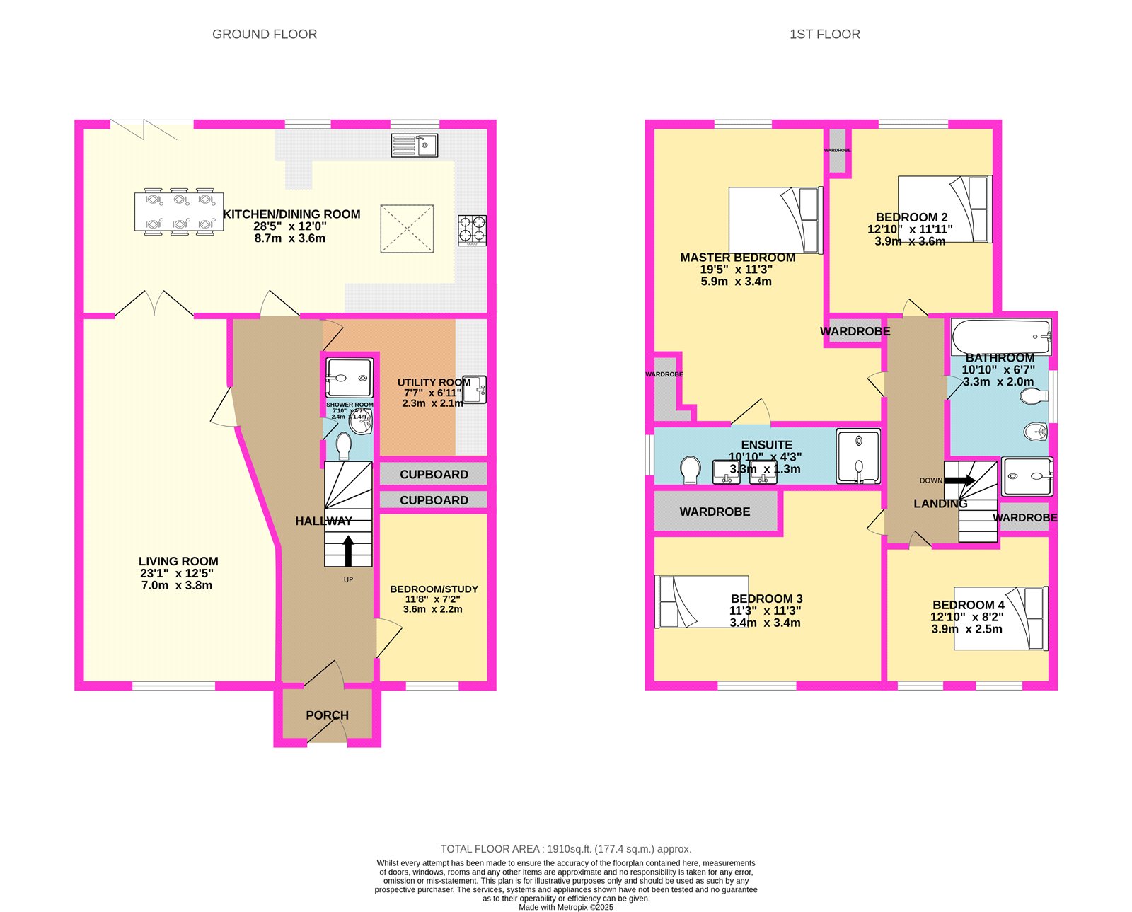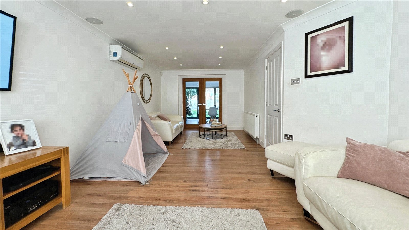 Upstairs, all four bedrooms feature fitted wardrobes, with the master bedroom enjoying air conditioning and a luxurious en-suite shower room with his-and-her sinks and underfloor heating. Another bedroom is also fitted with air conditioning, while the stylish four-piece family bathroom benefits from underfloor heating, ensuring comfort and convenience throughout.
