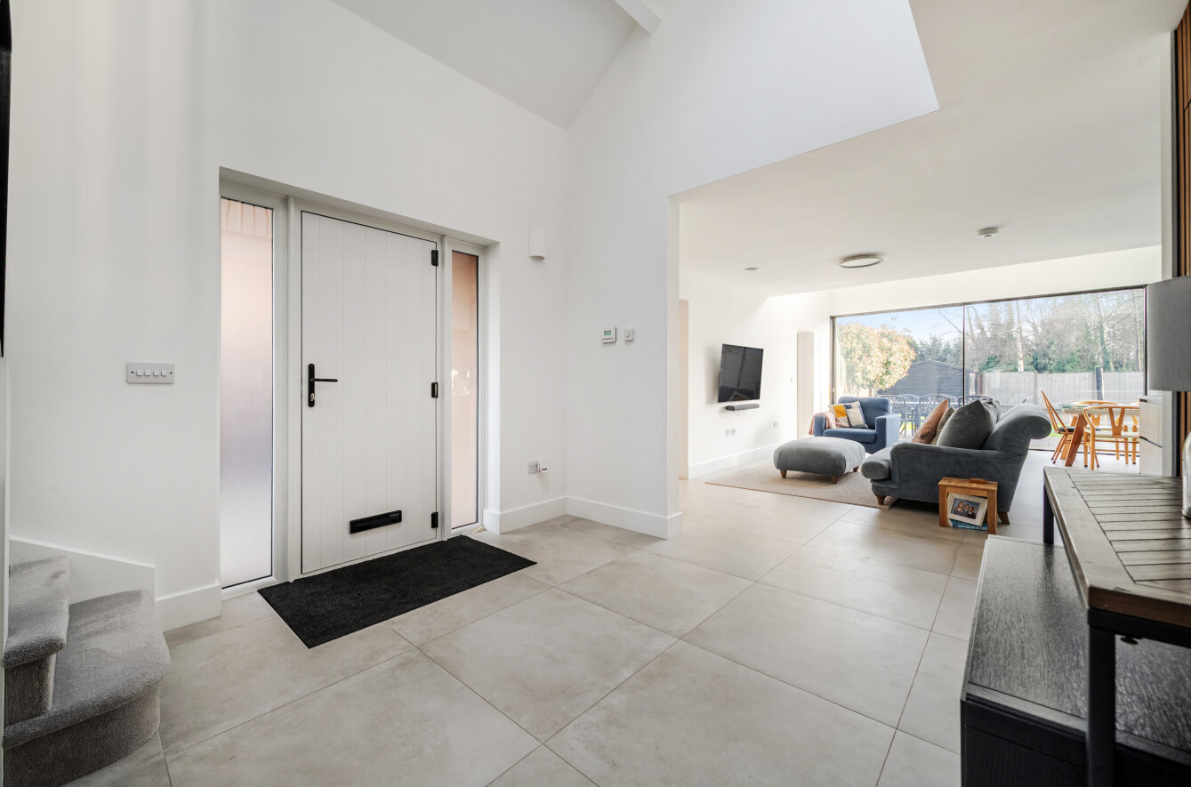 At the heart of the home is a showpiece open-plan kitchen, living, and dining area, designed for modern family living and entertaining. The kitchen boasts quartz worktops, a central island, integrated appliances, a practical pantry, bespoke sliding doors opening seamlessly to the garden, and two skylights in the dining area, flooding the space with natural light. Underfloor heating across the ground floor and a whole-home ventilation system ensure exceptional comfort and air quality.