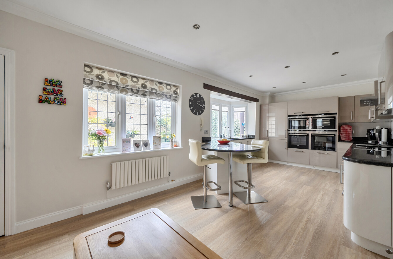 Inside, a welcoming and expansive hallway provides a seamless introduction to the ground floor, connecting a series of thoughtfully designed reception spaces. At the heart of the home lies a stunning kitchen/breakfast room, impeccably appointed with sleek contemporary cabinetry and premium integrated appliances. Features include a Franke tri-flow tap, Quooker boiling water tap, combination microwave/oven, steamer oven, two additional ovens, five-ring induction hob, underfloor heating, and water softener. A beautifully positioned bay window frames views over the front gardens, while a relaxed seating area creates the perfect space for everyday family living.