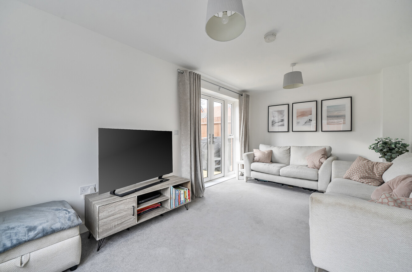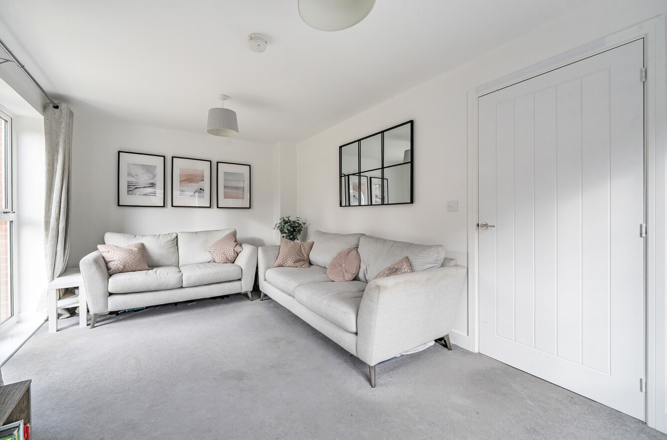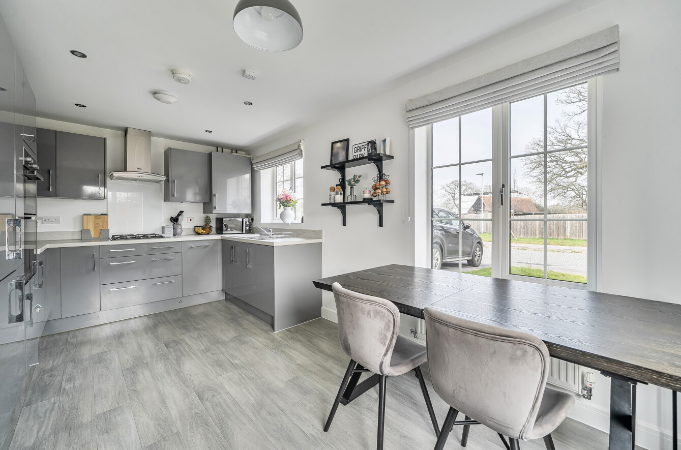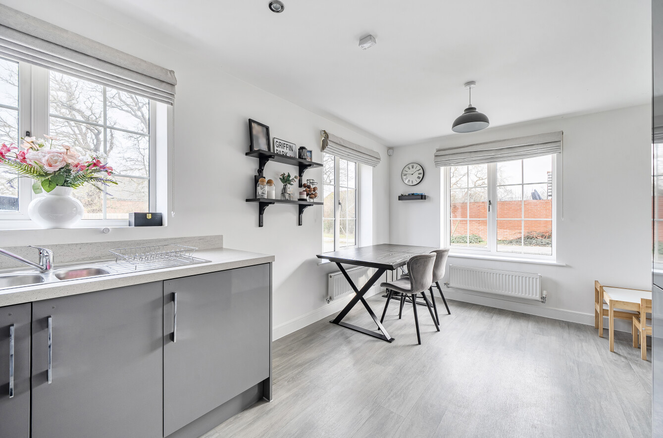 Upstairs, the sense of space and light continues with a bright and airy landing. The principal bedroom features double-aspect windows and a well-appointed en-suite shower room. Bedroom two is another generous double with dual-aspect windows, while bedroom three works perfectly as a home office, nursery, or guest room. A modern and contemporary family bathroom completes the first-floor layout.