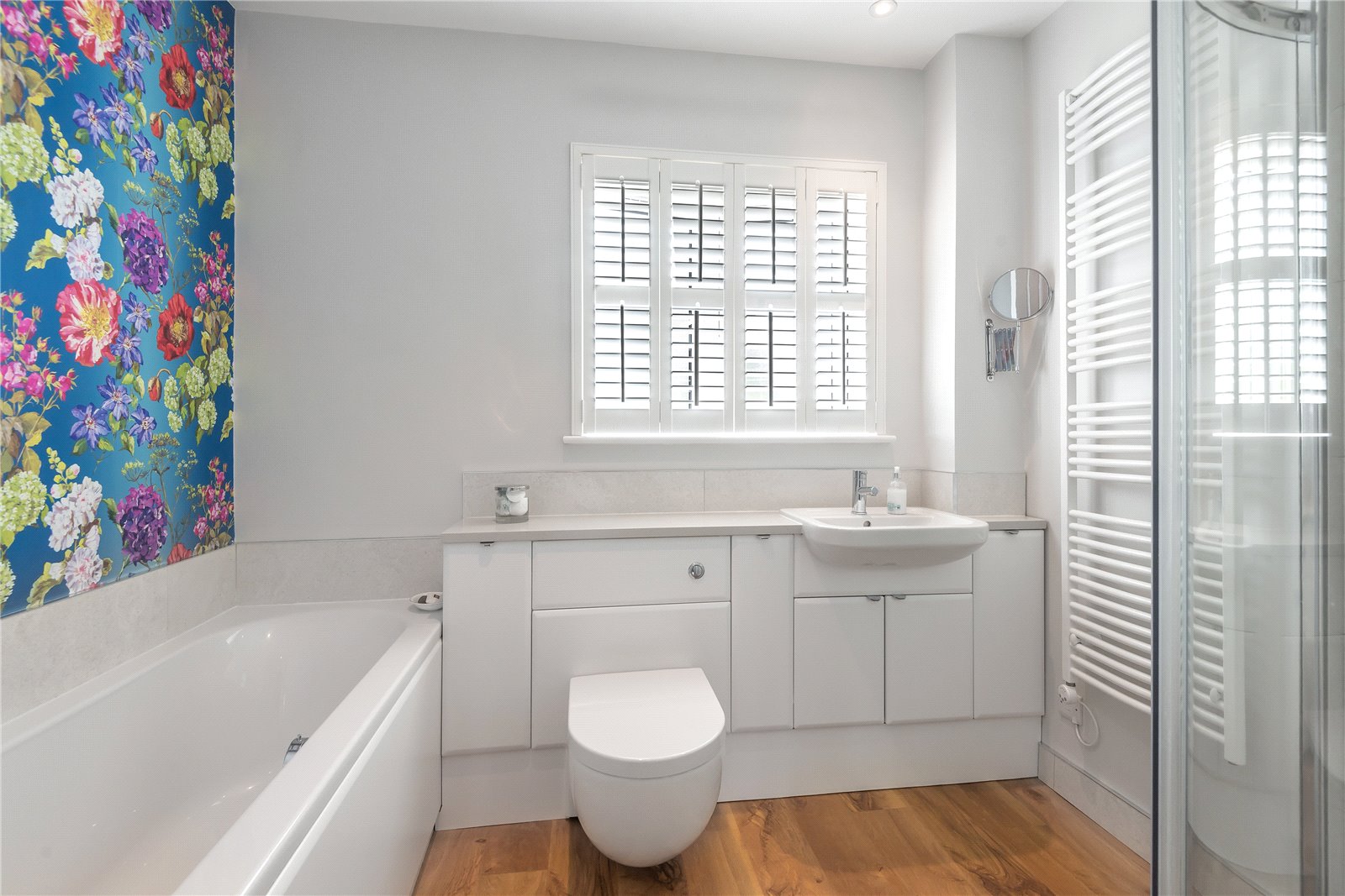 The first floor consists of a large open plan living space with custom fitted shutters and a feature fireplace, with lovely views across the wooded copse. To the rear is a light and airy kitchen/breakfast room that leads out onto the patio and West facing enclosed garden.