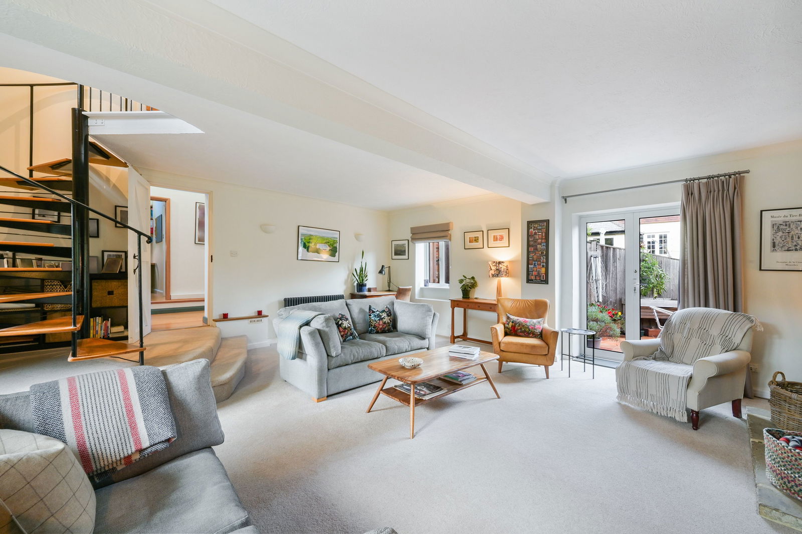 A feature spiral staircase leads to the first floor which has two good sized double bedrooms with built in wardrobes and a bathroom.