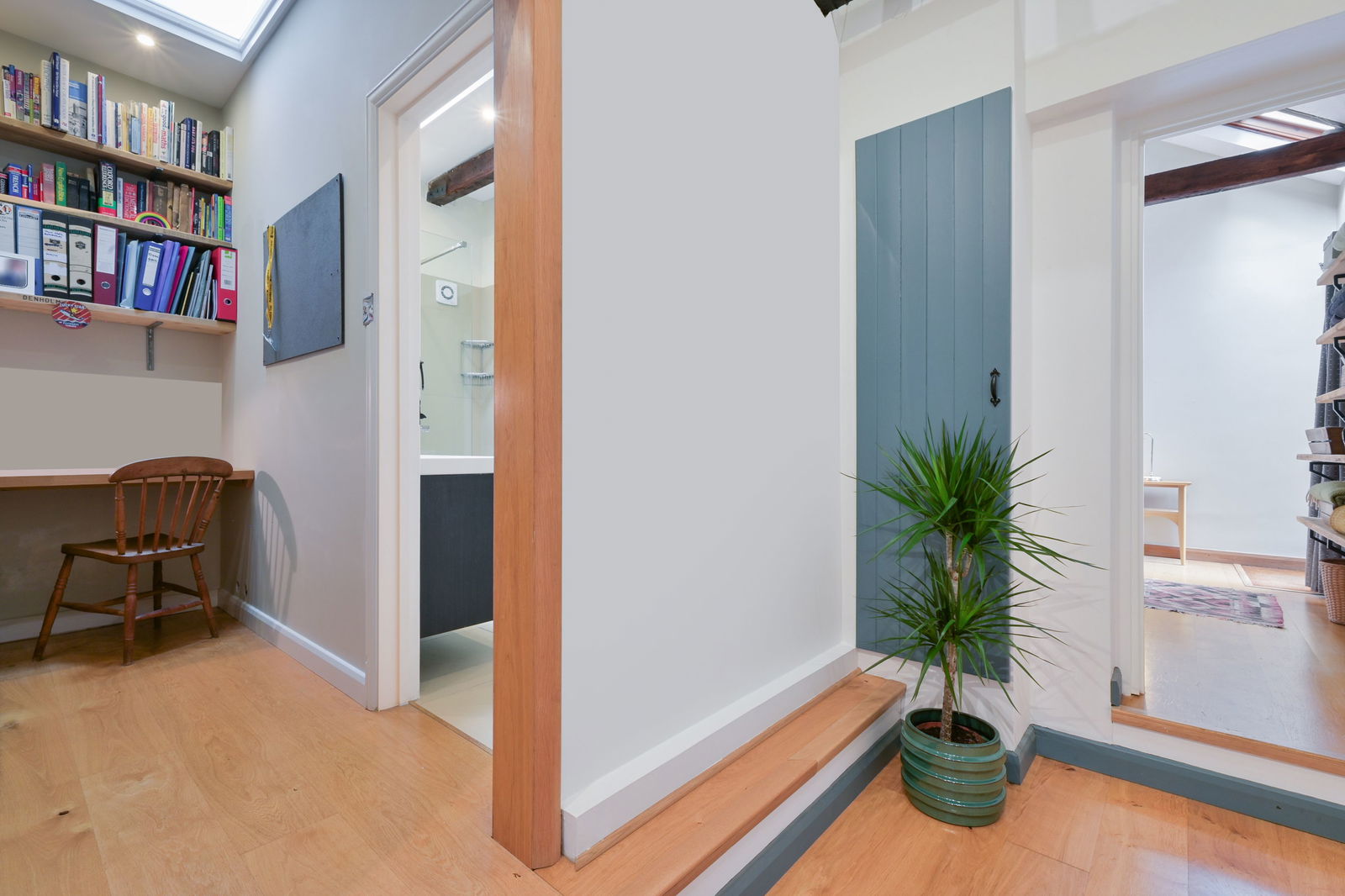Entering the property at the ground floor, the large hallway leads to a contemporary kitchen featuring quartz worktops, integrated Neff appliances, and plenty of space for a large dining table. The utility room is accessed from the kitchen and features a butler sink. The wide hallway leads up one step to the ground floor master bedroom which has a jack and jill shower room with double sink. A useful study is lit by overhead roof light. The sitting room is two steps down from the hallway and is a beautifully bright room with a working log burner set into an exposed brick chimney. This room has access to a breakfast courtyard that is perfectly positioned to benefit from the morning sun.