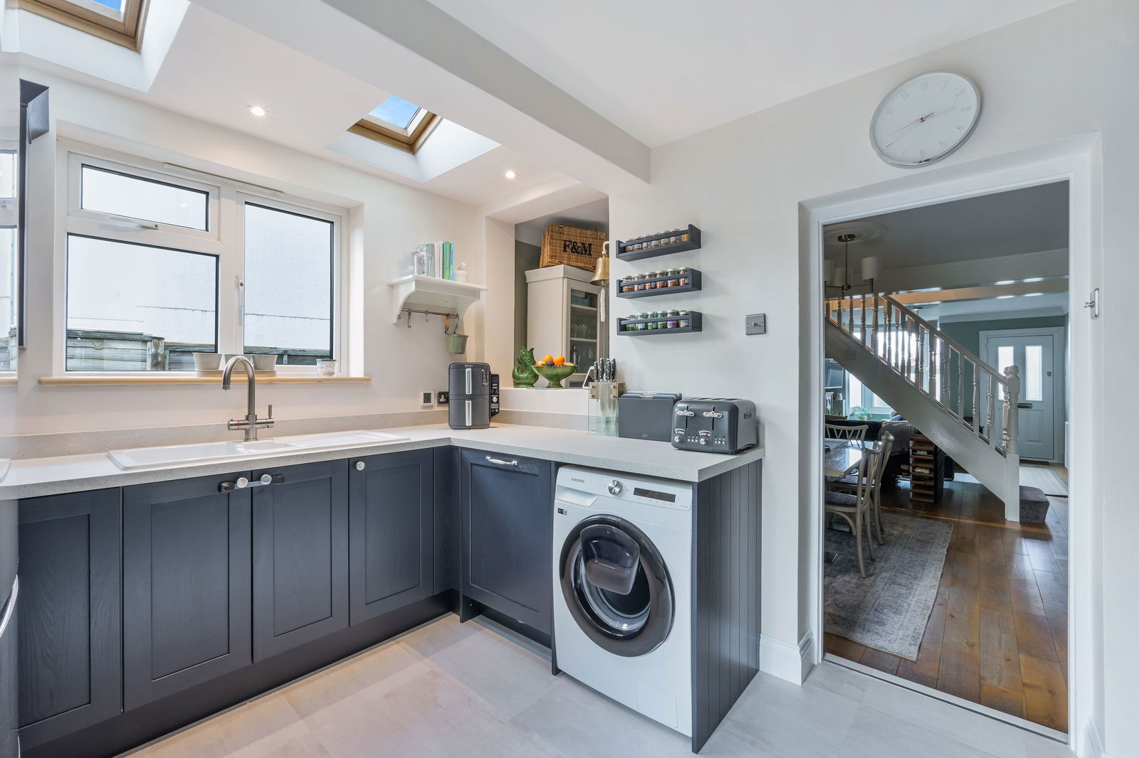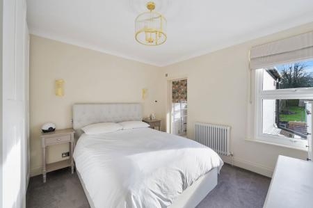 The ground floor is wonderfully bright and open, centred around an impressive 30ft open-plan living and dining space ideal for both everyday living and entertaining. Features include wood flooring, a striking bay window and a contemporary electric feature fireplace installed in 2024. To the rear, the sleek modern kitchen is a standout space, enhanced by underfloor heating, skylights that flood the room with natural light, streamlined cabinetry, a boiling water tap, integrated wine fridge and direct access to the garden. A thoughtfully positioned outdoor guest WC adds further practicality.