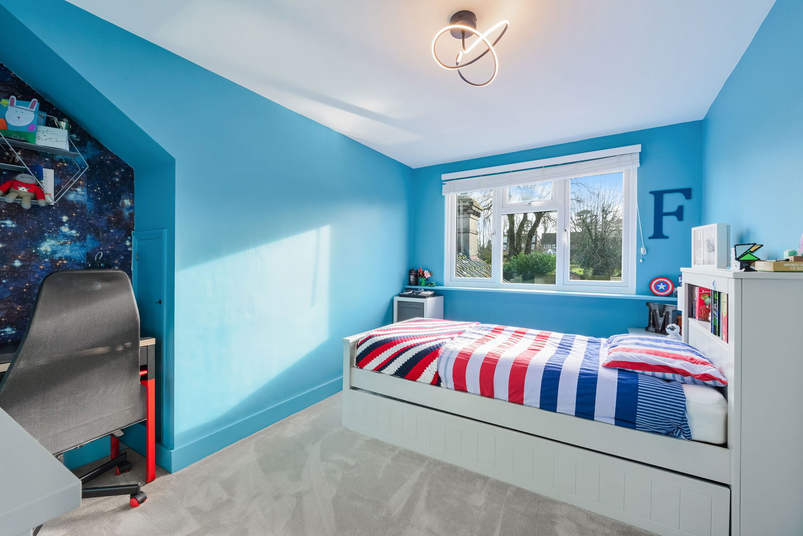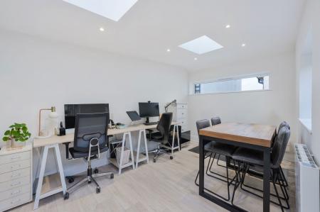 Externally, the property continues to impress. A raised sun terrace creates an inviting space for outdoor dining and entertaining, overlooking a generous lawn framed by mature planting. Additional benefits include off-street parking and a detached home office/gym, newly converted in 2024 — an ideal solution for remote working or fitness use.