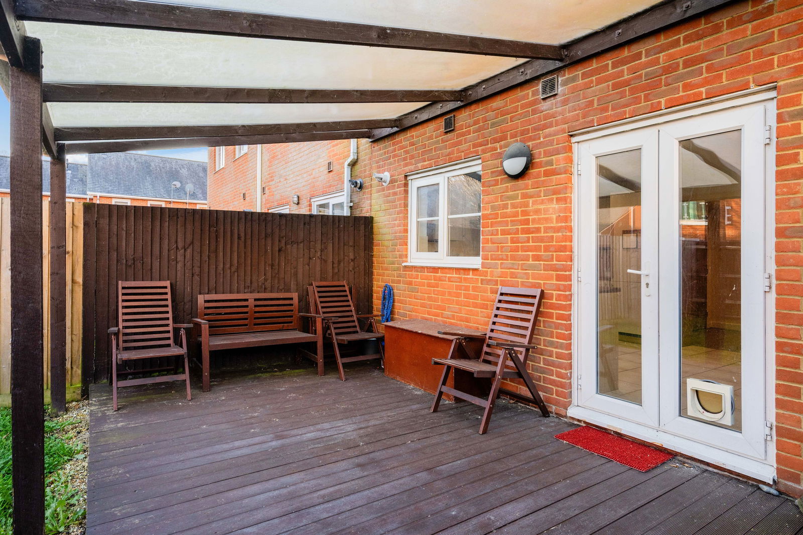 Outside, the garden is low maintenance with a covered decking area, lawn, shed, and side access to the front of the property.