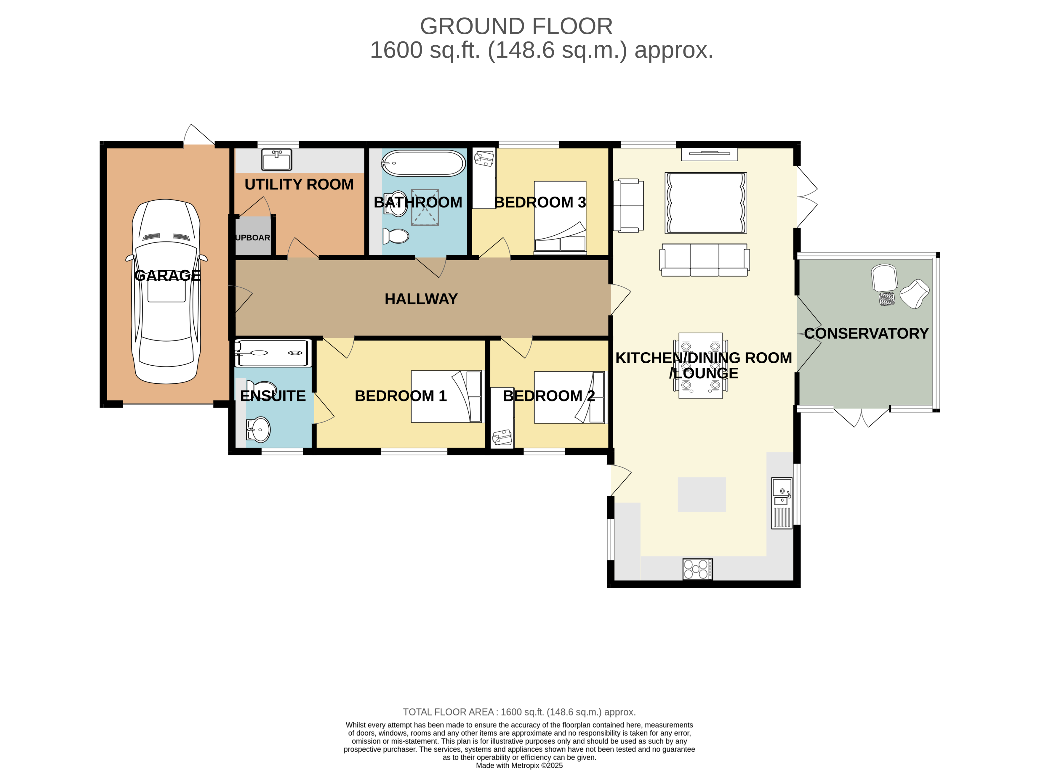 Internally there is a large open plan living area with space for an extensive fully fitted kitchen with built in appliances. Ample space for sitting and dining furniture with doors into a lovely conservatory overlooking the garden. There are three good size bedrooms with the master en-suite in addition to a further bathroom/shower room if preferred. There is also a separate utility room. Internal finish is of a high standard with oak doors and all floor coverings included. The property is well insulated and is warmed by electric underfloor heating throughout which is powered by an air source heat pump and benefits from 3kw PV panels.