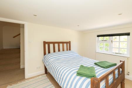 As you enter the property you are welcomed into the open plan kitchen/living/dining room, with ample natural light, space for a dining table, sofas and freestanding furniture. The light and compact kitchen has been fitted with a range of base and eye level units, complemented by worktops and space for all of the expected appliances. Original wooden flooring and overhead beams offer characterful charm and a sense of warmth throughout this space. A small landing provides access to both bedrooms, with steps leading up to the second bedroom which is currently set up as a home office. Steps also lead down and round to the main bedroom which has space for a double bed and freestanding furniture. Both rooms enjoy far reaching views of the neighbouring countryside. The well proportioned bathroom, with white suite and bath with overhead shower finishes off the accommodation.