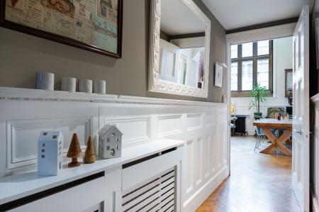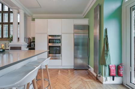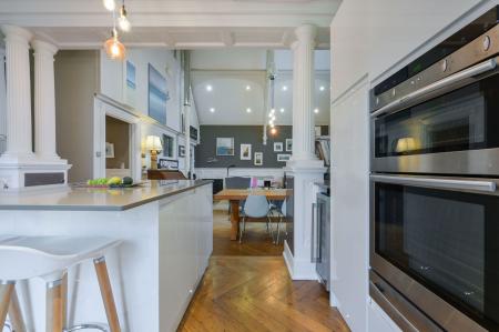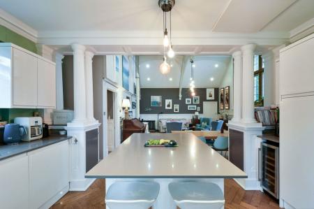 The property has been fully renovated to a high standard, carefully retaining many of its original character features. A welcoming entrance hall leads into the impressive drawing room, which forms the heart of the home. The well-appointed kitchen is positioned just off the main living space and features integrated appliances, a central island, and doors opening out to the garden, ideal for both everyday living and entertaining.