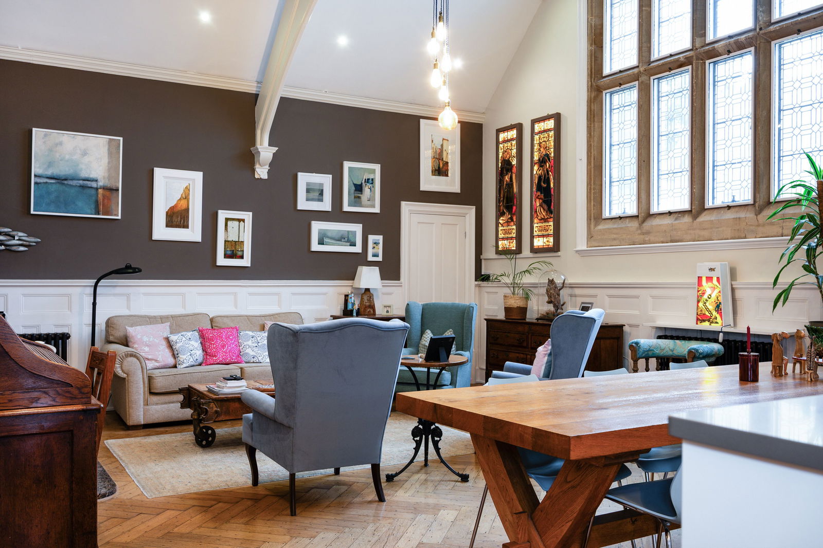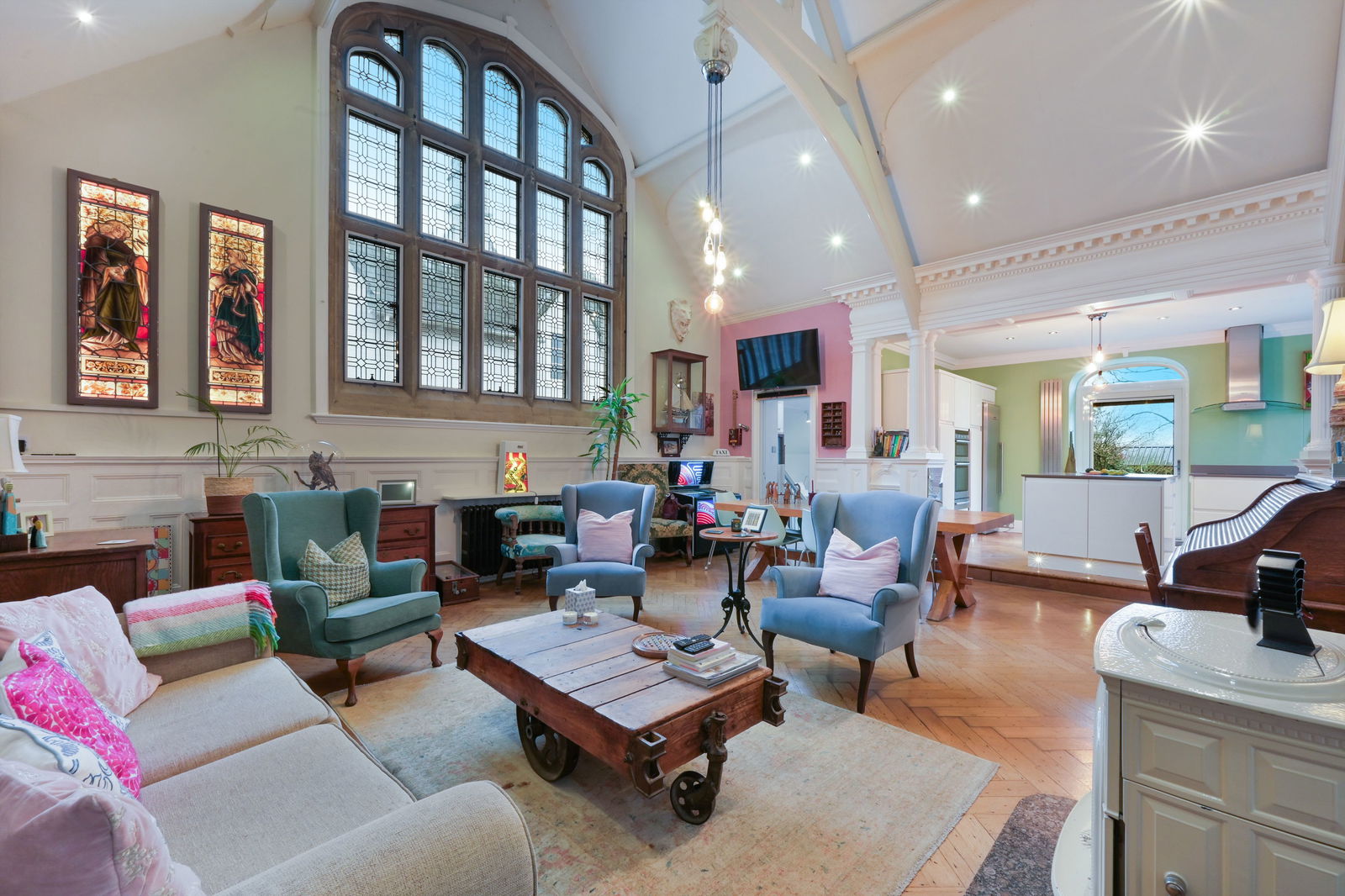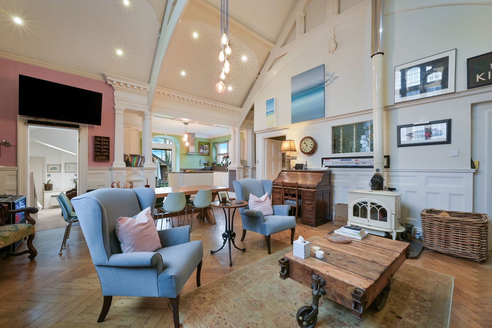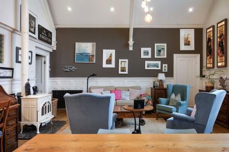 The accommodation flows from a stunning open-plan drawing room featuring a vaulted ceiling, solid oak flooring, a striking wood burner, and a beautiful original feature window, creating a wonderfully light and airy atmosphere throughout.