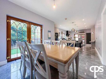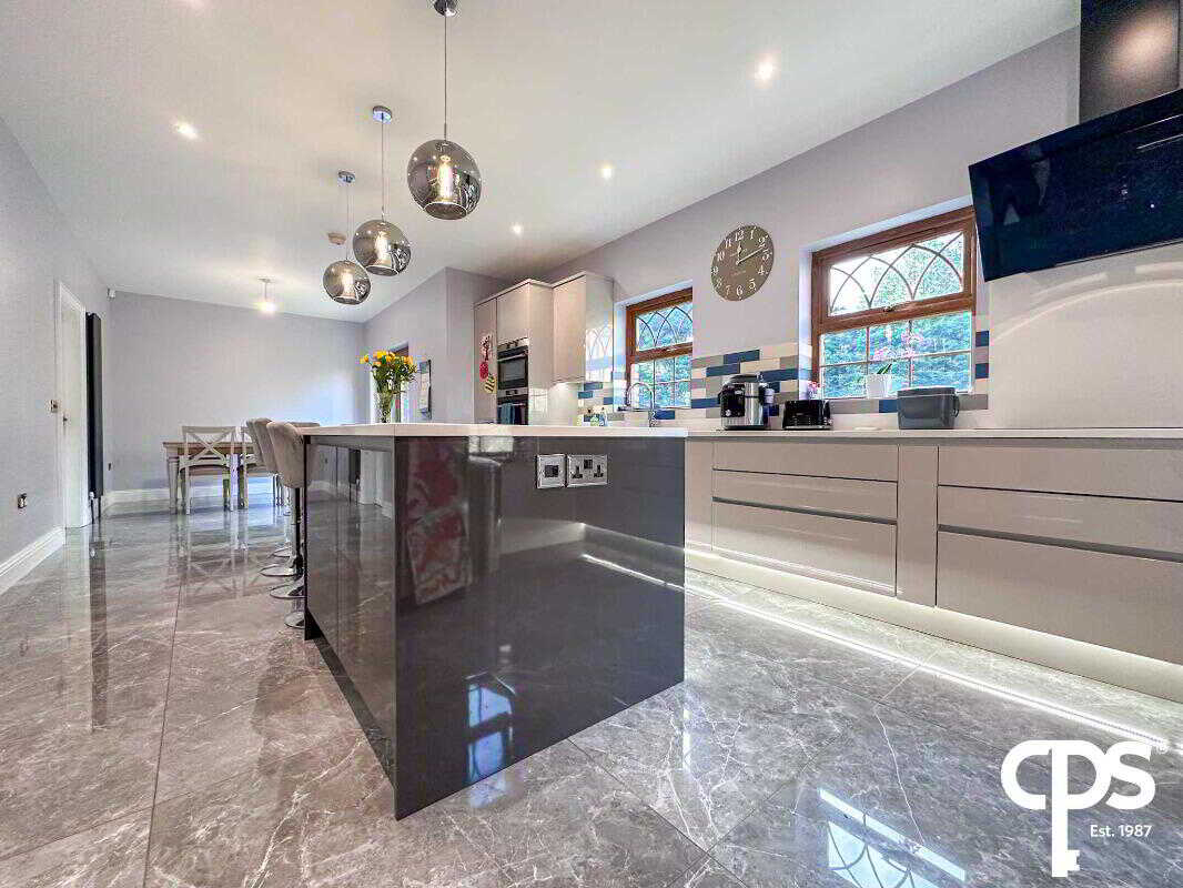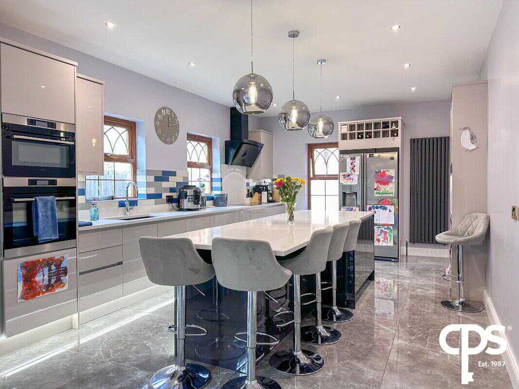 The kitchen area of this property is finished to a very high modern standard with high and low units throughout, including a feature glass-front display cabinet. The kitchen features illuminated kicker boards, downlights under the high units and is finished with a striking quartz worktop. A large statement island offers space for multiple seats and excellent storage within. The kitchen comes equipped with a Quooker hot tap, integrated dishwasher,and high-spec induction hob, overhead extractor fan, and stacked oven and combination oven. The kitchen area also offers a dining area with double patio doors to the rear.