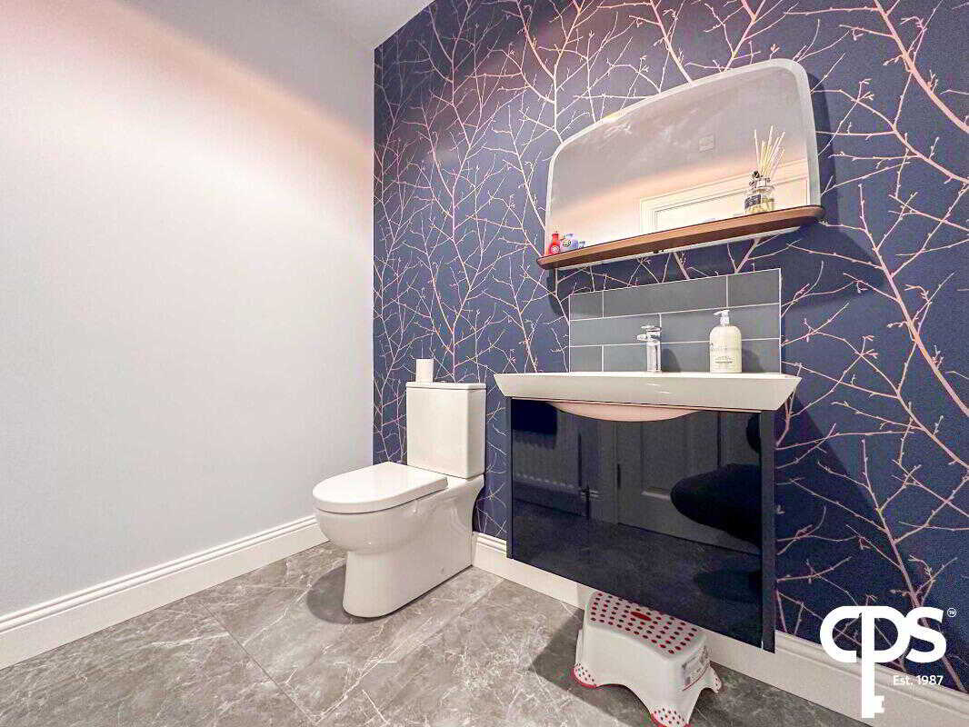 The stylish downstairs w/c comprises of a two piece suite to include WC and floating wash hand basin to include a vanity unit. The flooring is finished in a Spanish ceramic tile and the room is tastefully decorated with a feature wallpapered wall within.