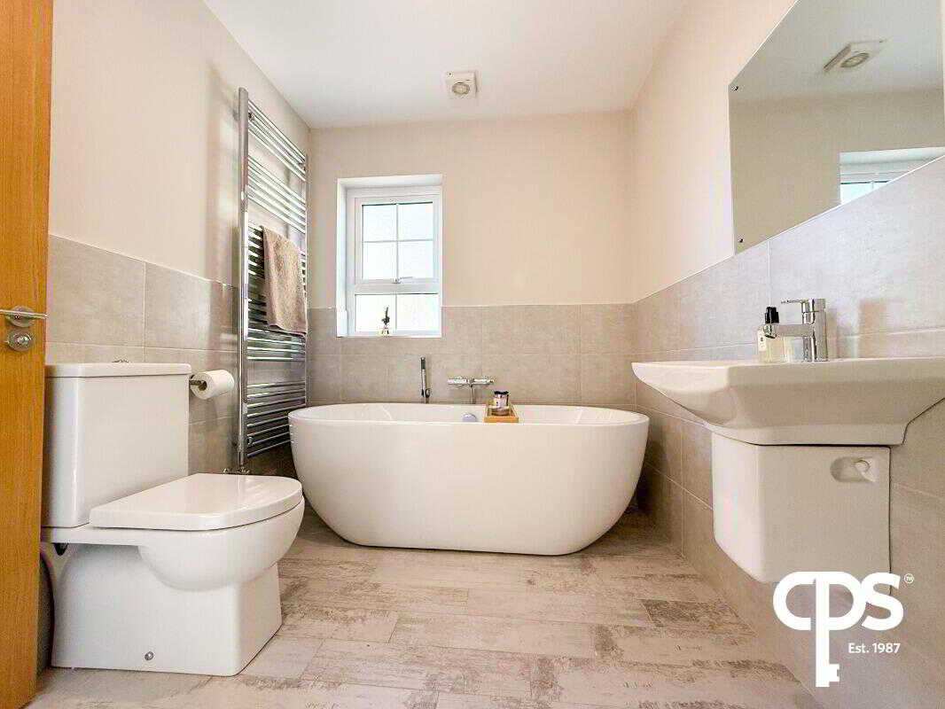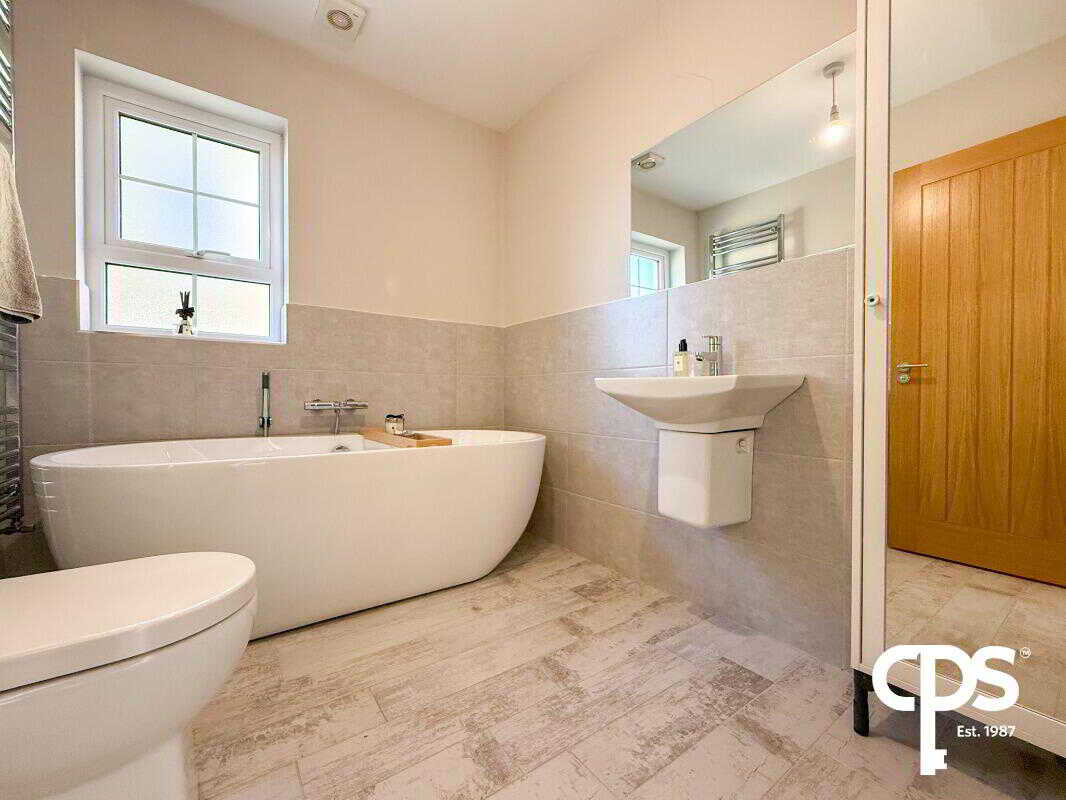 Fully tiled, with freestanding bath, wall-mounted radiator, floating sink unit, toilet, and separate 1m x 1m walk-in shower. Bright and modern family bathroom with high-quality fixtures.