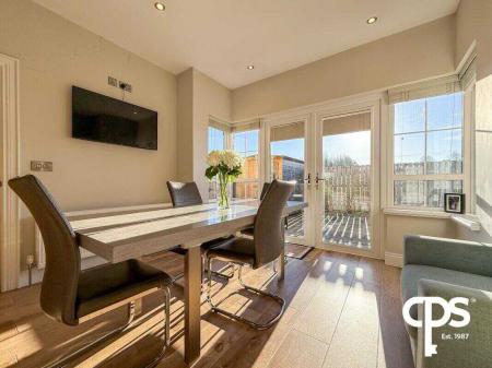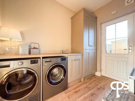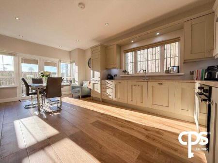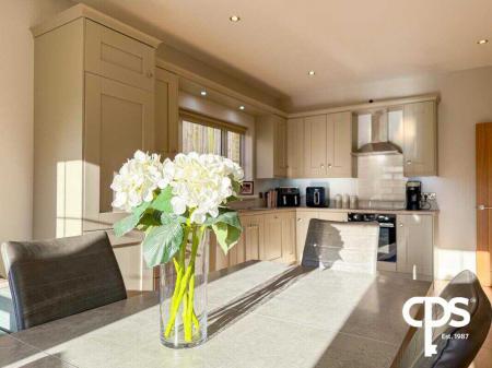 Modern, spacious, and well-equipped, with tiled flooring, a range of high and low fitted units, integrated oven and induction hob with extractor fan, stainless steel sink, and integrated fridge/freezer. The kitchen also includes pantry-style storage and double radiators. Double patio doors open to the rear garden, and a single side door provides access to the utility room.