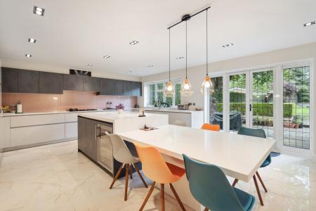 As you head inside, there is immediately a light and airy feel to the property via an impressive entrance hallway, with then it's standout feature on the ground floor being the spacious 37'9 x 16'10 entertaining area which comes as a joint kitchen/family/dining room. This magnificent space really is the hub of the home, and offers a variety of high end, contemporary styled handleless units, a centre isle, and also enough space for more than one sofa and a large dining table/chairs.