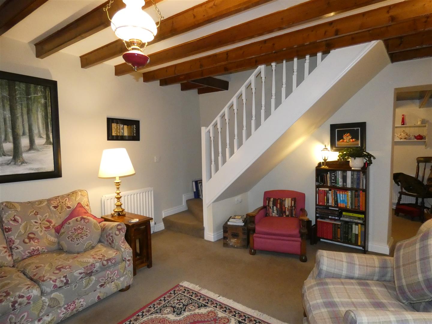 Living Room: - 4.24m min x 3.94m (13'11" min x 12'11") - Having window to the front, feature brick arched fireplace with inset cast-iron stove, alcove cupboards, beamed ceiling, staircase to the first floor and opening through to..