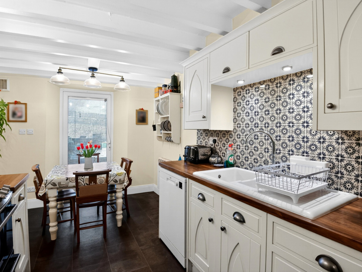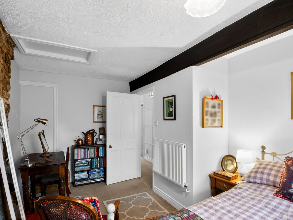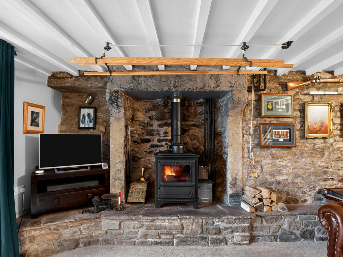 The ground floor comprises an entrance hall featuring a stone-flagged floor and exposed stone walls, a kitchen-diner with access to the garden, and a cosy living room with a multi-fuel stove set within an impressive fireplace.