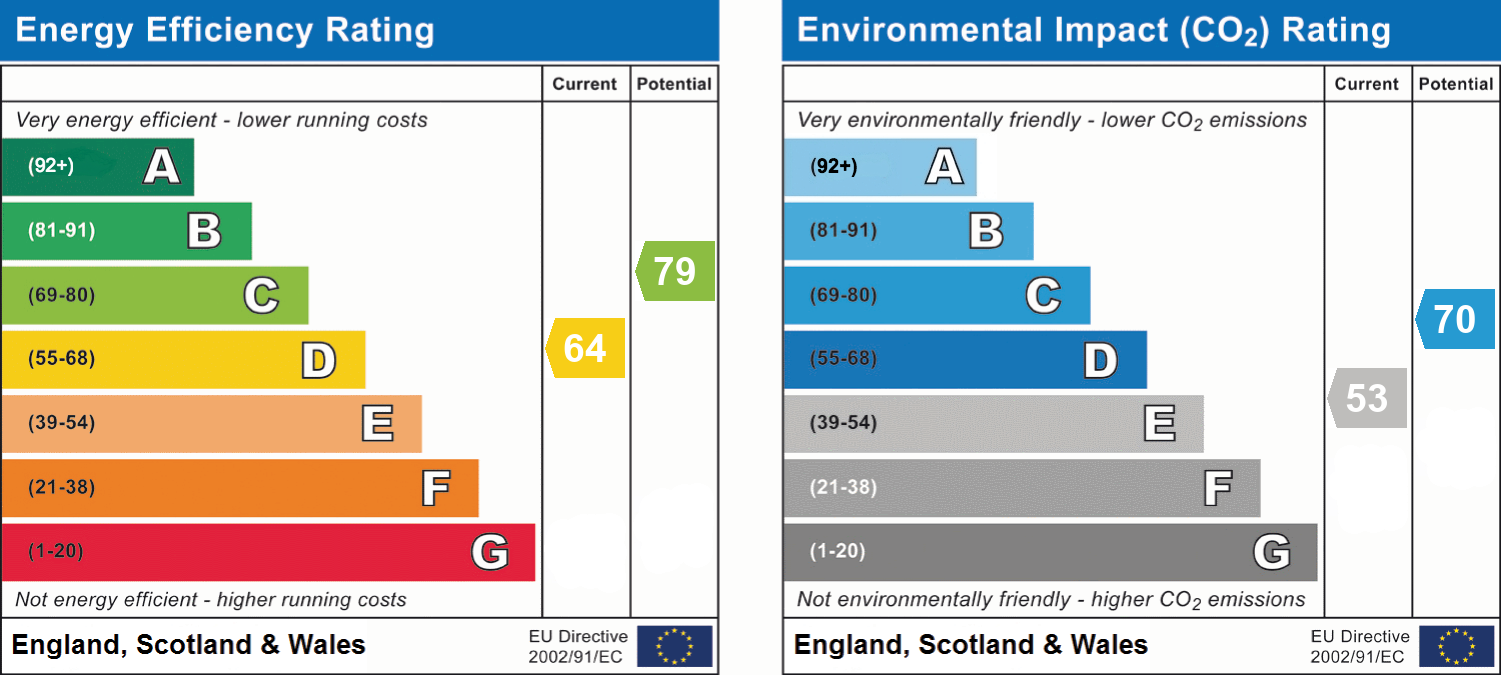 To the first floor are two spacious double bedrooms, complemented by a large family bathroom fitted with both a bath and a separate shower enclosure. The first bedroom also benefits from a WC.