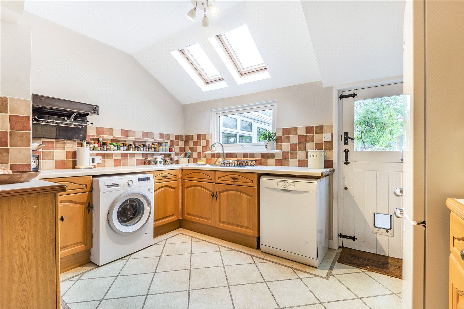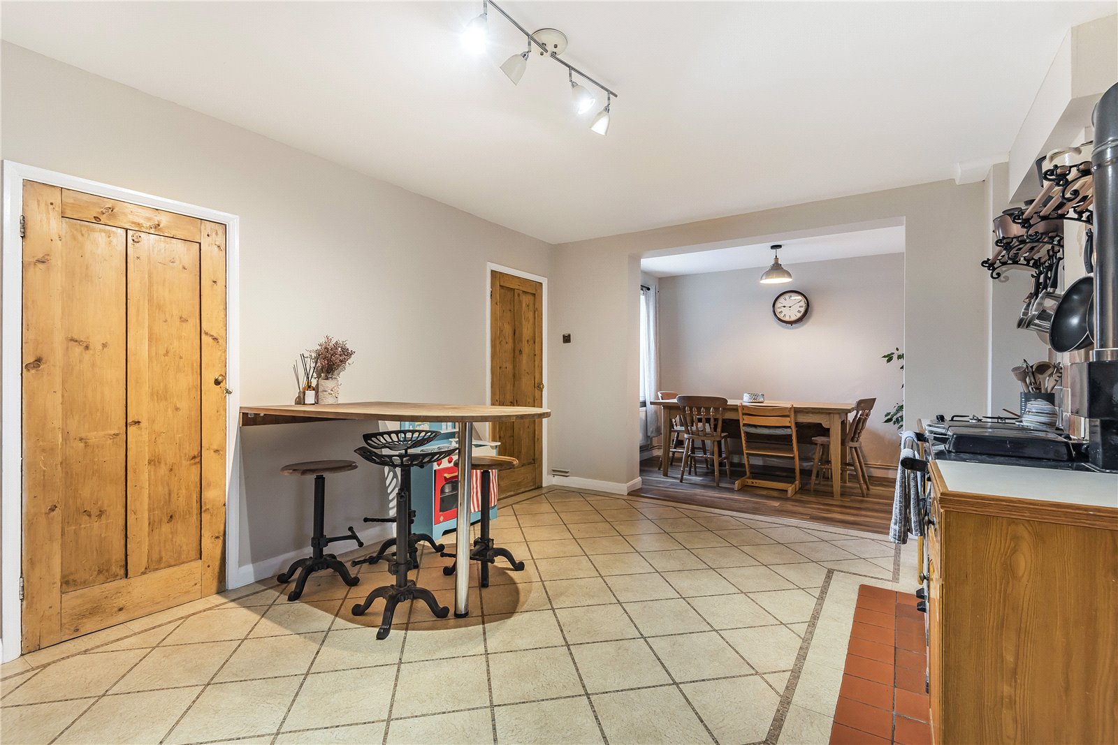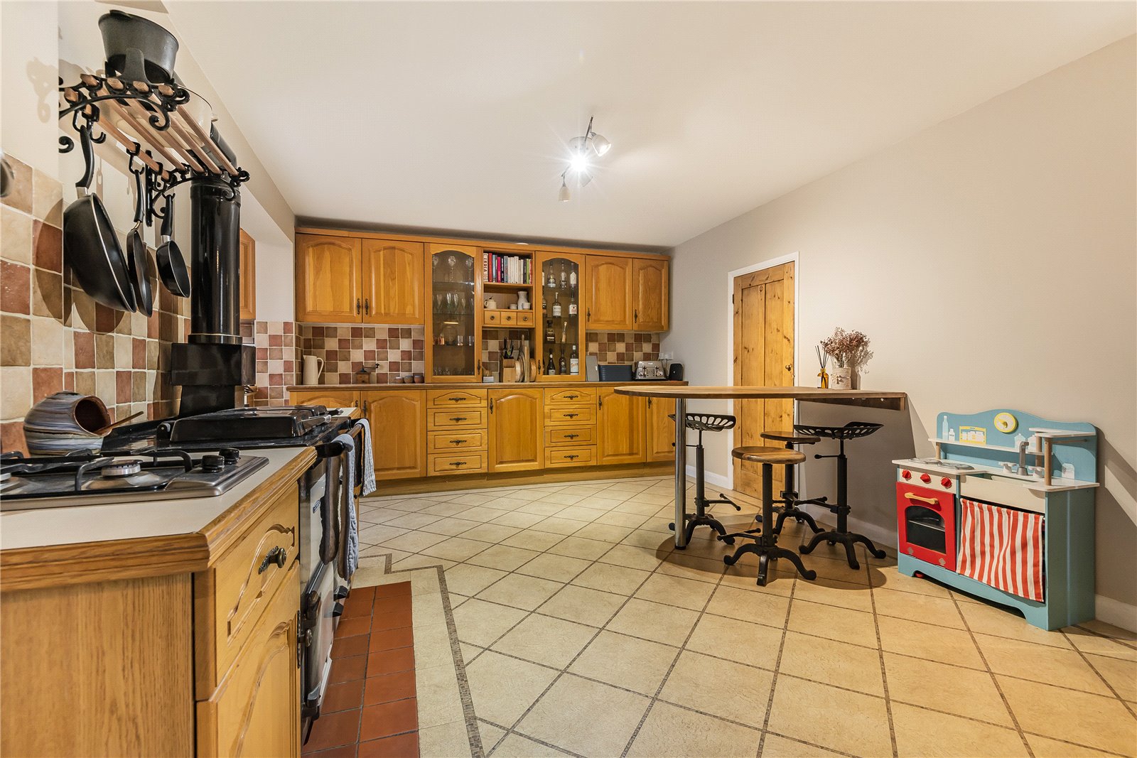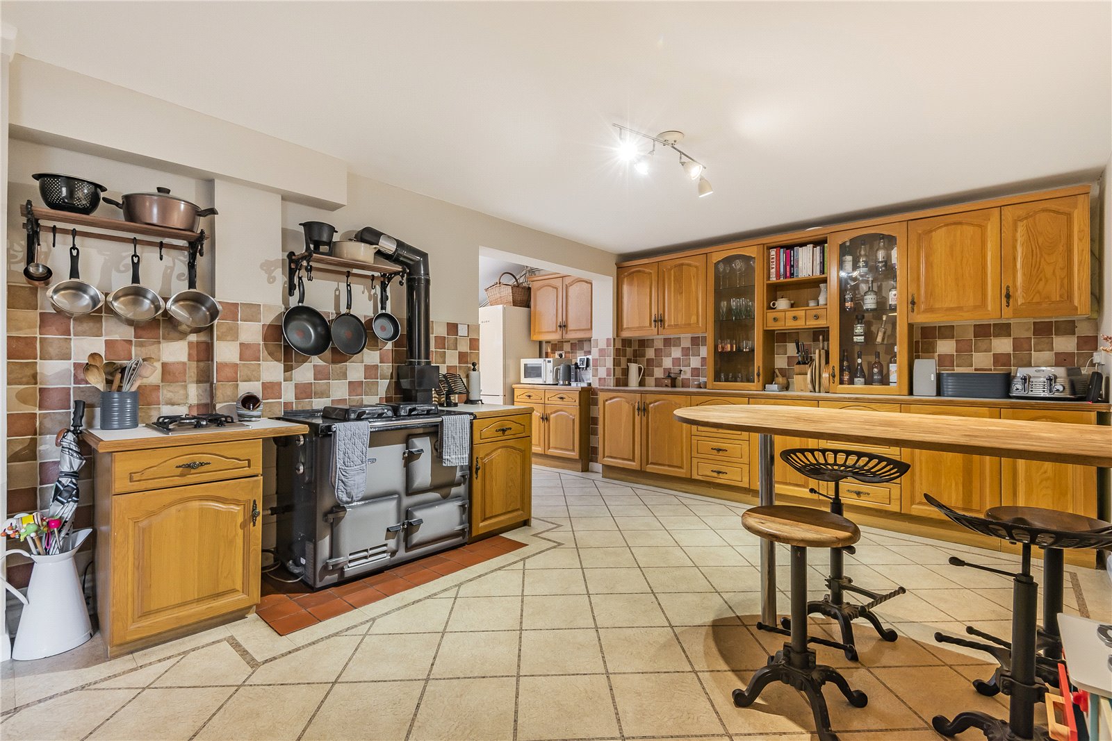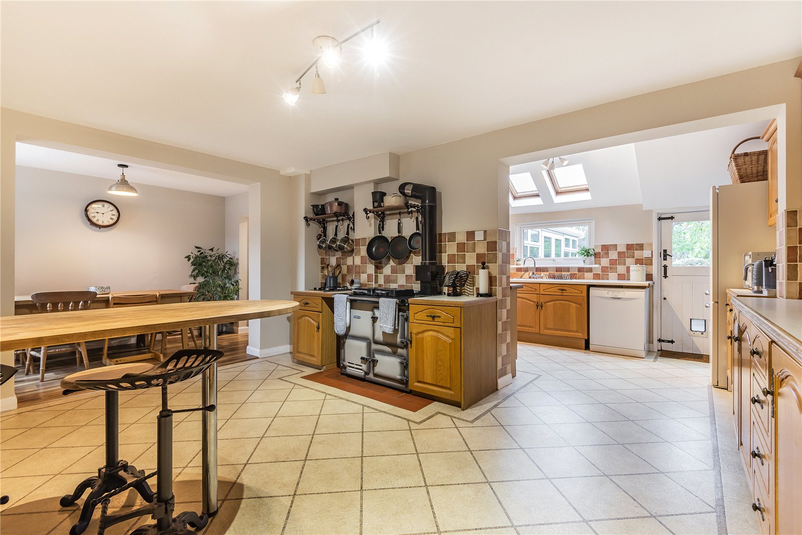 LARGE OPEN PLAN KITCHEN / BREAKFAST ROOM: With tiled flooring, ceiling spotlights, breakfast bar with seating area below, fitted Rayburn gas range with ovens and cooking hobs over, extensive range of cottage style oak fronted cupboard and base units with numerous work surfaces over, further walk in larder cupboard, decorative tiled surrounds, extended area of kitchen with Velux style windows, further range of fitted cupboard and base units with work surfaces over, fitted 1 ½ drainer sink unit with mixer tap, space for dishwasher, space for washing machine, space for fridge freezer, fitted grill, double glazed window with aspect over rear sun terrace and 140 foot rear garden, stable door also opening onto rear sun terrace and rear 140 foot south facing garden.