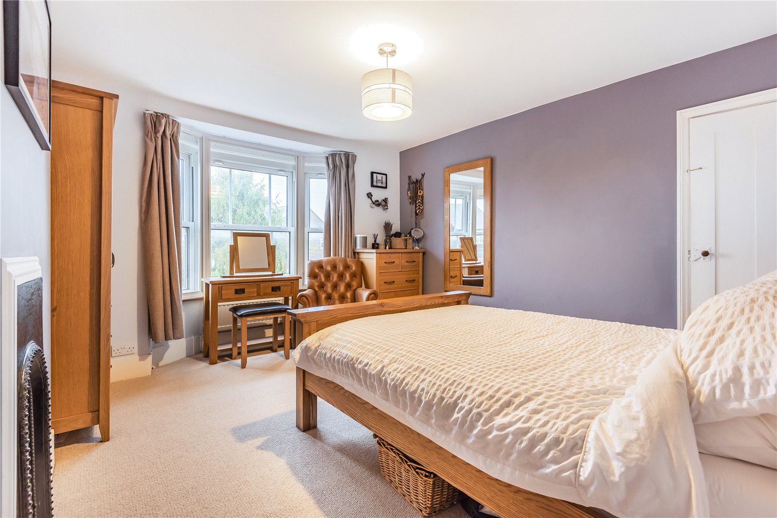 BEDROOM ONE: With attractive cast iron 19th century Victorian fireplace, radiator, walk in dressing wardrobe cupboard with double glazed arch shaped window. Bay double glazed window with aspect to front and view of the village green.