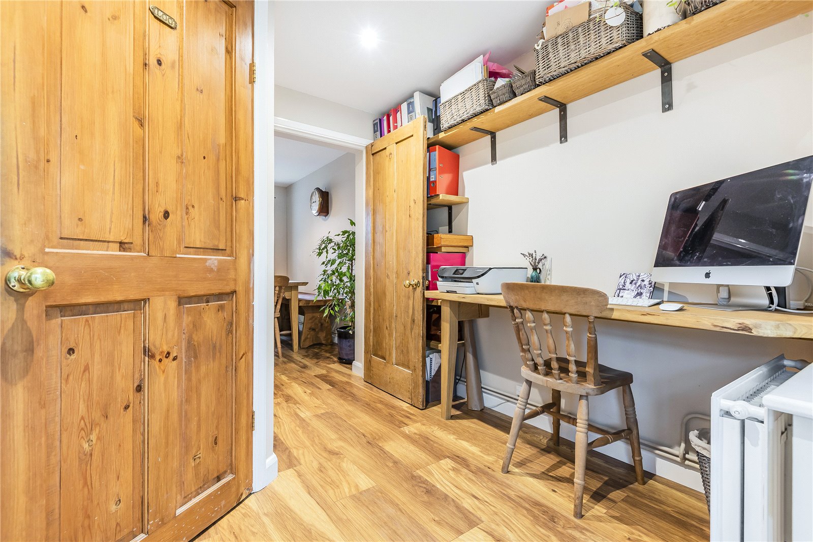STUDY: Approached from the dining room by an old feature wooden door, with a bespoke solid wood desk and work area, oak wood effect flooring, radiator, fitted shelving, double glazed doors opening to generous sized conservatory, further door to downstairs cloakroom.