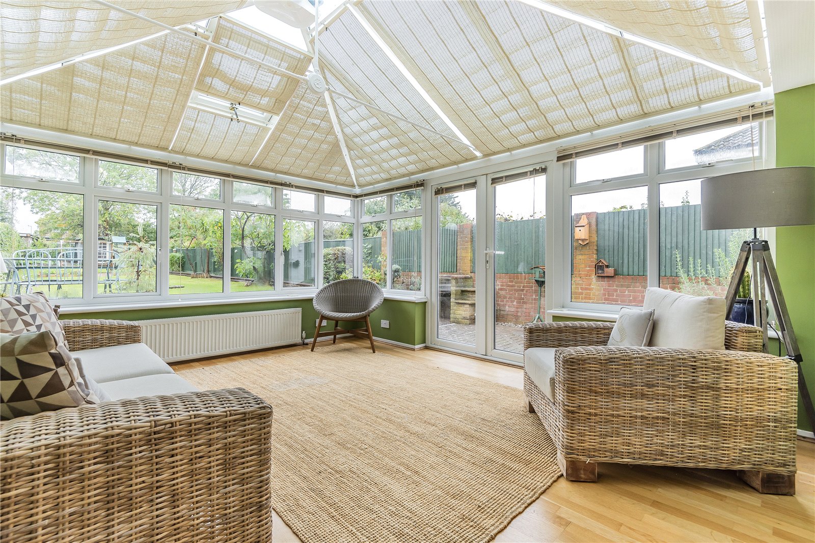 CONSERVATORY: Comprising of brick and rendered lower half with double glazed upper area under a glazed pitched roof, radiator, wall lights, further French double glazed doors opening to rear south facing 140 foot rear garden.