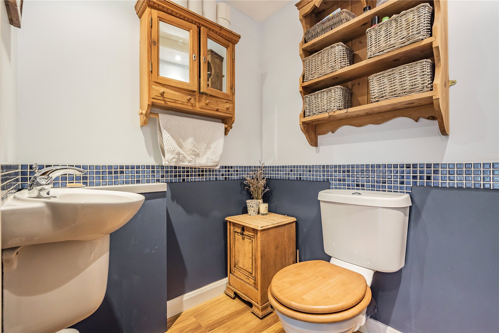 DOWNSTAIRS CLOAKROOM ( POTENTIAL TO CONVERT OR ENLARGE INTO A SECOND SHOWER ROOM / BATHROOM ): Approached by old feature wooden door from the study, with a low level W.C. , wall mounted white wash basin with chrome tap, part tiled walls.