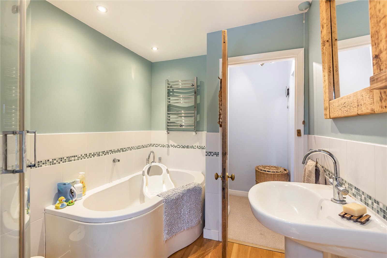 FAMILY BATHROOM / SHOWER ROOM: With fitted panelled bath with chrome taps, tiled walls, separate glazed and chrome concaved shower cubicle with shower control system, pedestal wash basin, wall mounted chrome towel rail, W.C., double glazed window.