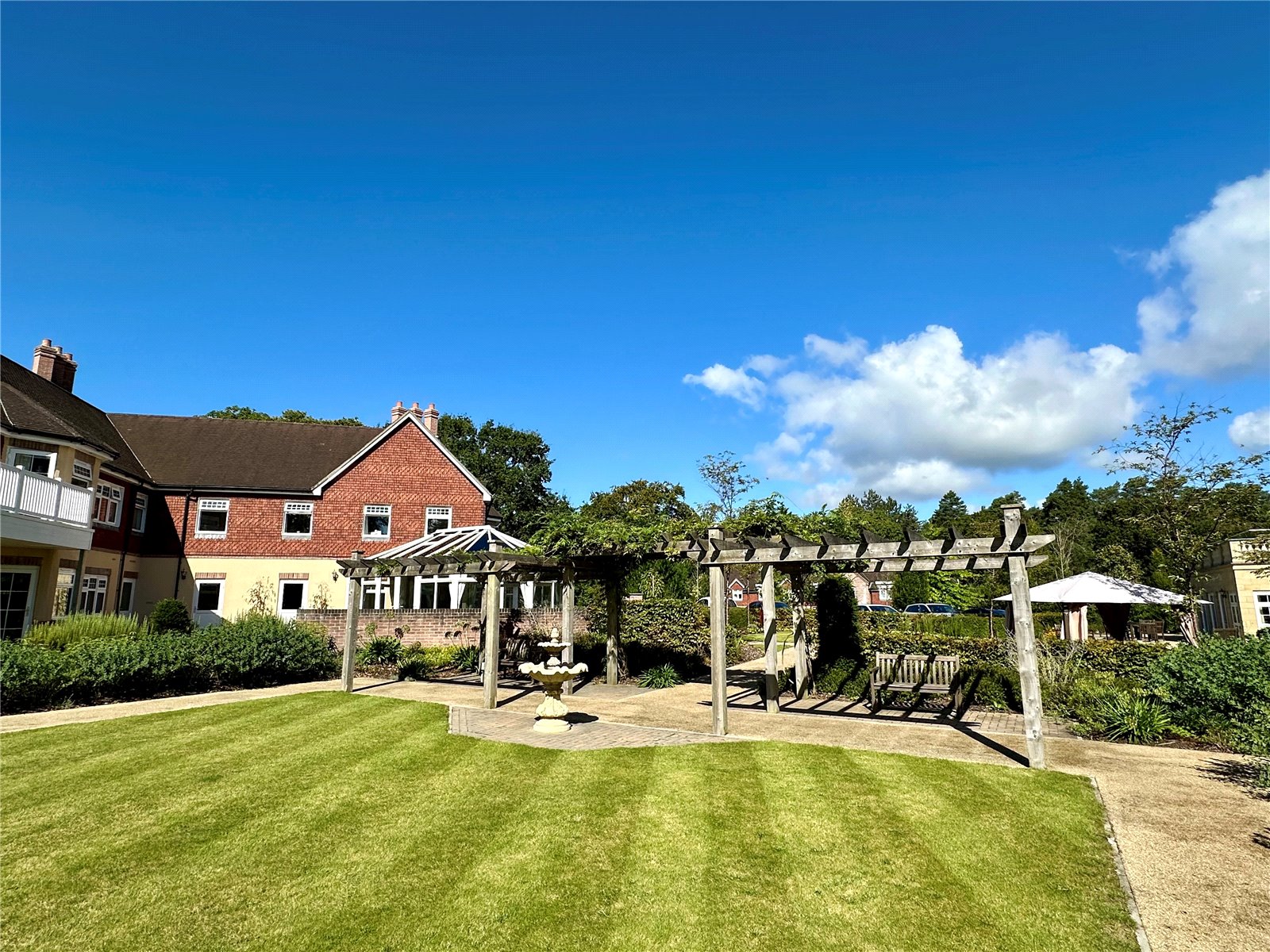 The apartment sits to the back of the exclusive development with a private covered balcony area leading from the lounge with woodland views across the rear and further benefits from woodland walks and the communal landscaped gardens with a pergola, water fountains and statues. Lighting throughout. Plenty of parking spaces for residents and visitors.