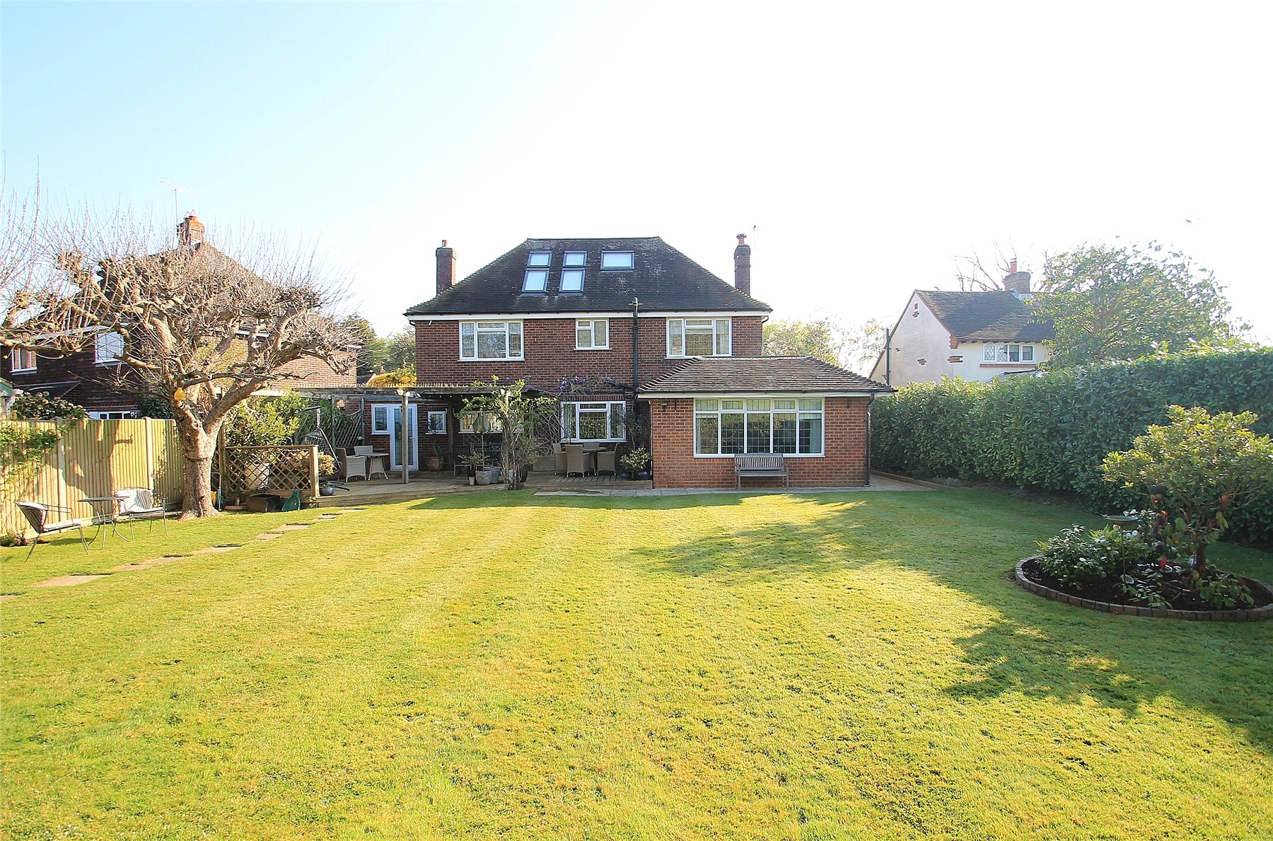 Outside, to the front is a large driveway for several vehicles and an area of lawn. The South-West facing rear garden is a good size and benefits from a large patio area with an attractive, decked, pergola that leads to a large expanse of lawn. The enclosed garden has well-maintained hedging offering a good deal of privacy and an out-building in the far corner.