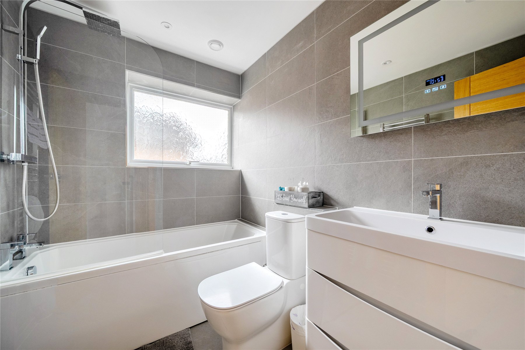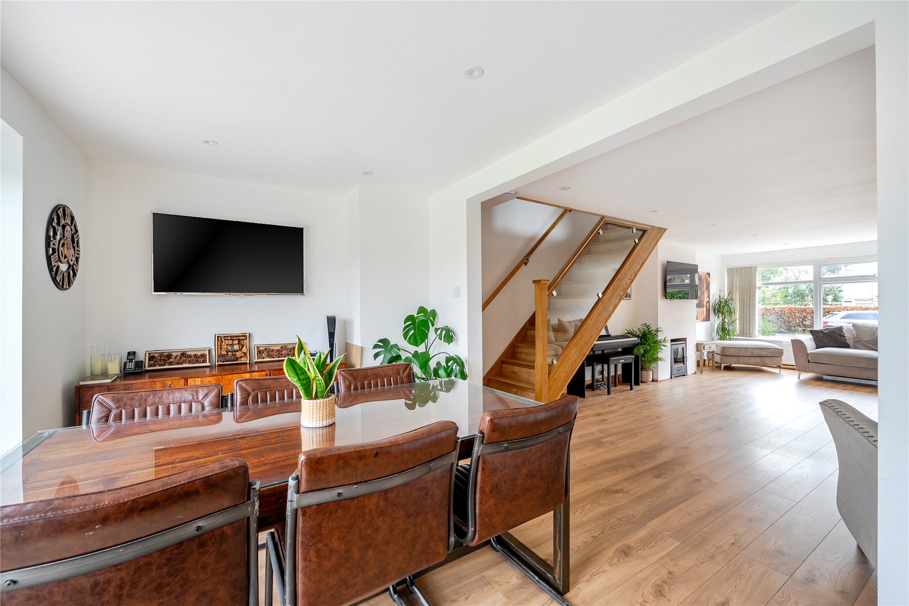 At the far end of the property, the stylish and thoughtfully designed kitchen forms the heart of the home. It features a central island breakfast bar, sleek quartz worktops, and a comprehensive range of integrated appliances. Both the kitchen and adjoining dining room benefit from bi-folding doors, seamlessly connecting indoor and outdoor living by opening onto the rear patioideal for entertaining. The sitting room is bright and generously proportioned, boasting a large picture window to the front and a striking integrated oak and glass staircase that adds a contemporary architectural feature.