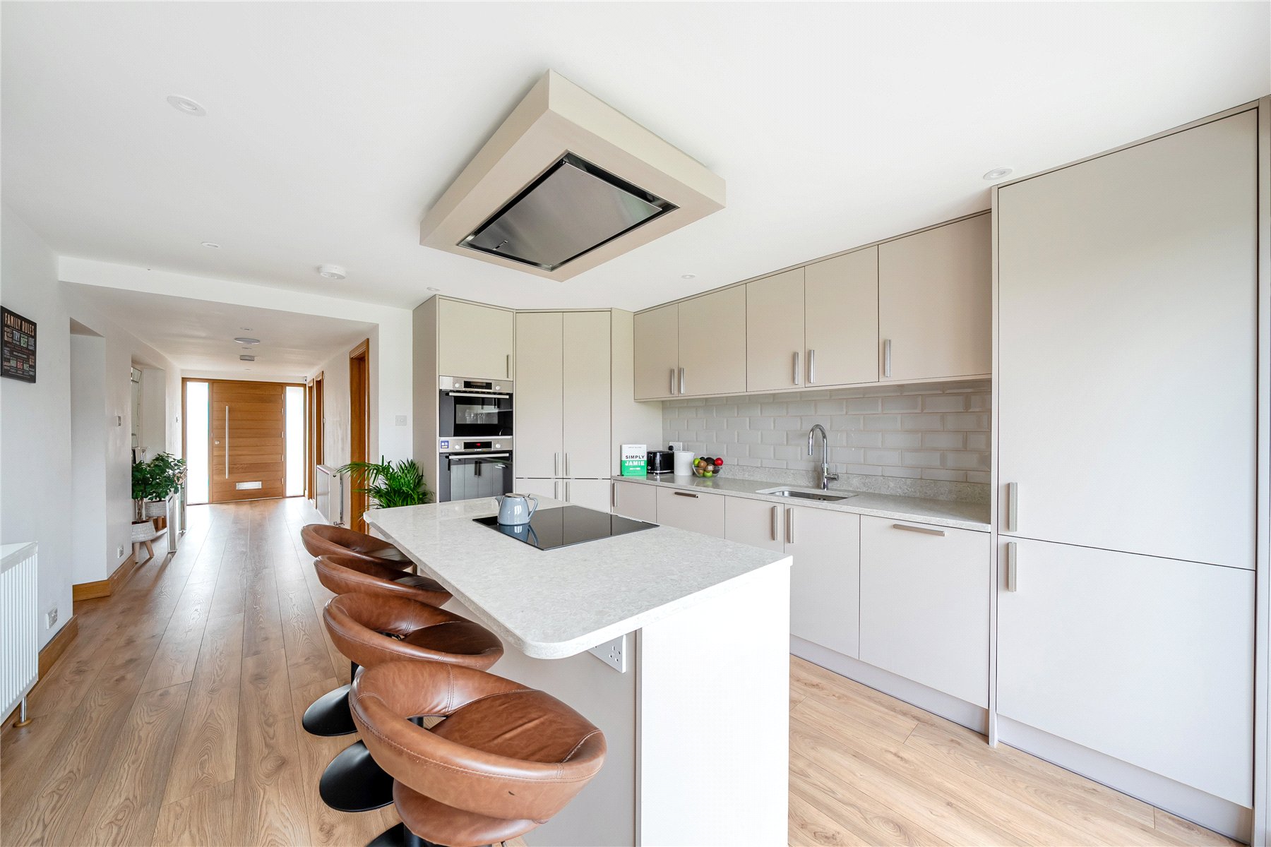 The front door opens into a long, light-filled hallway that immediately creates a sense of space and flow, providing access to all principal living areas. These include the garage, a modern shower room, and a versatile study enhanced by a skylightperfect for home working or quiet retreat.
