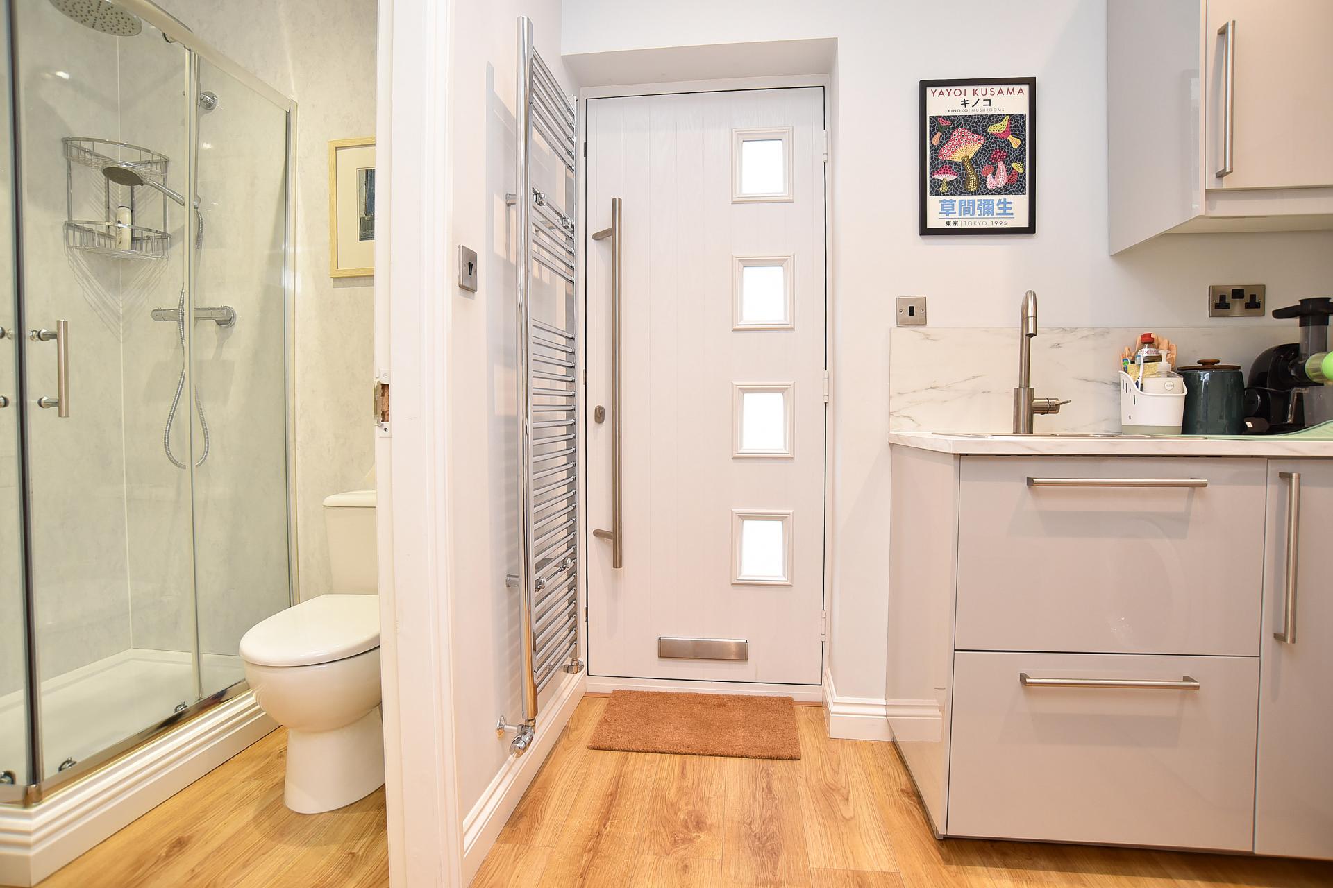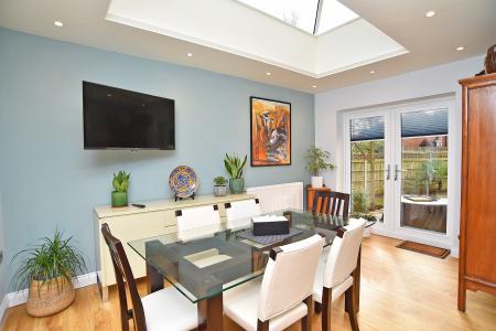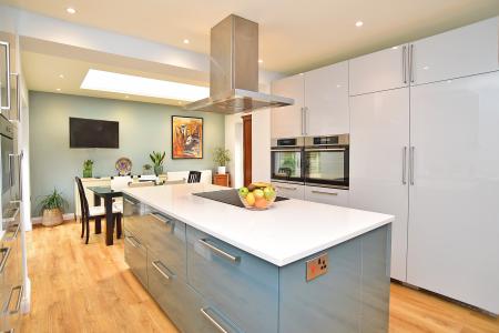 The contemporary open plan dining kitchen forms the heart of the home , fitted with a central island, modern induction hob and a comprehensive range of integrated appliances. The extended dining area creates an excellent open-plan layout ideal for entertaining and everyday living. The extension has introduced abundant natural light, with two sets of double doors leading to the garden and a large skylight with integrated feature lighting. In addition, the extension has created a separate utility room and a useful ground floor shower room, further improving functionality.