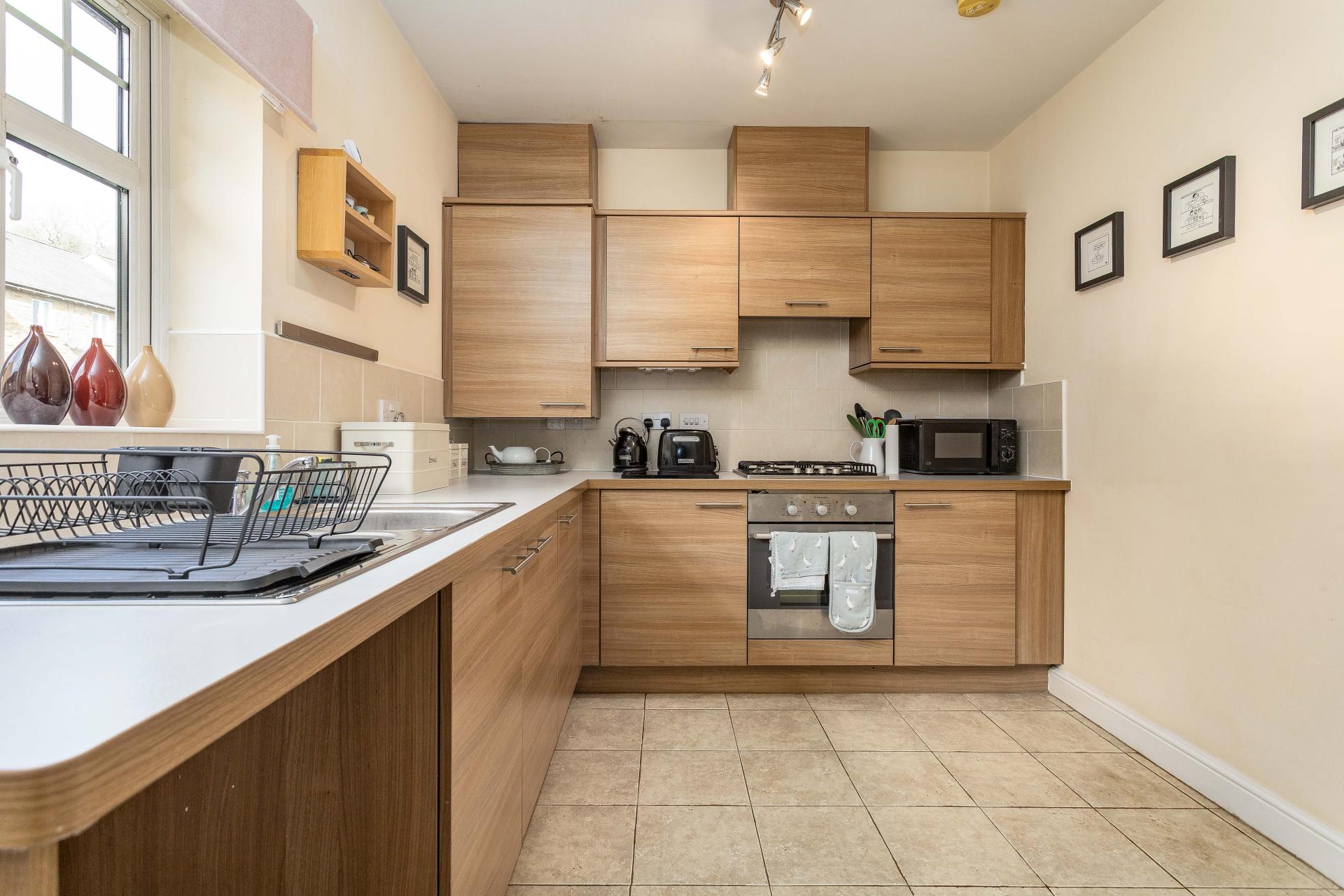 Fitted units with laminate worktops and stainless steel sink. Four-ring gas hob with electric oven below. Plumbed for washer.