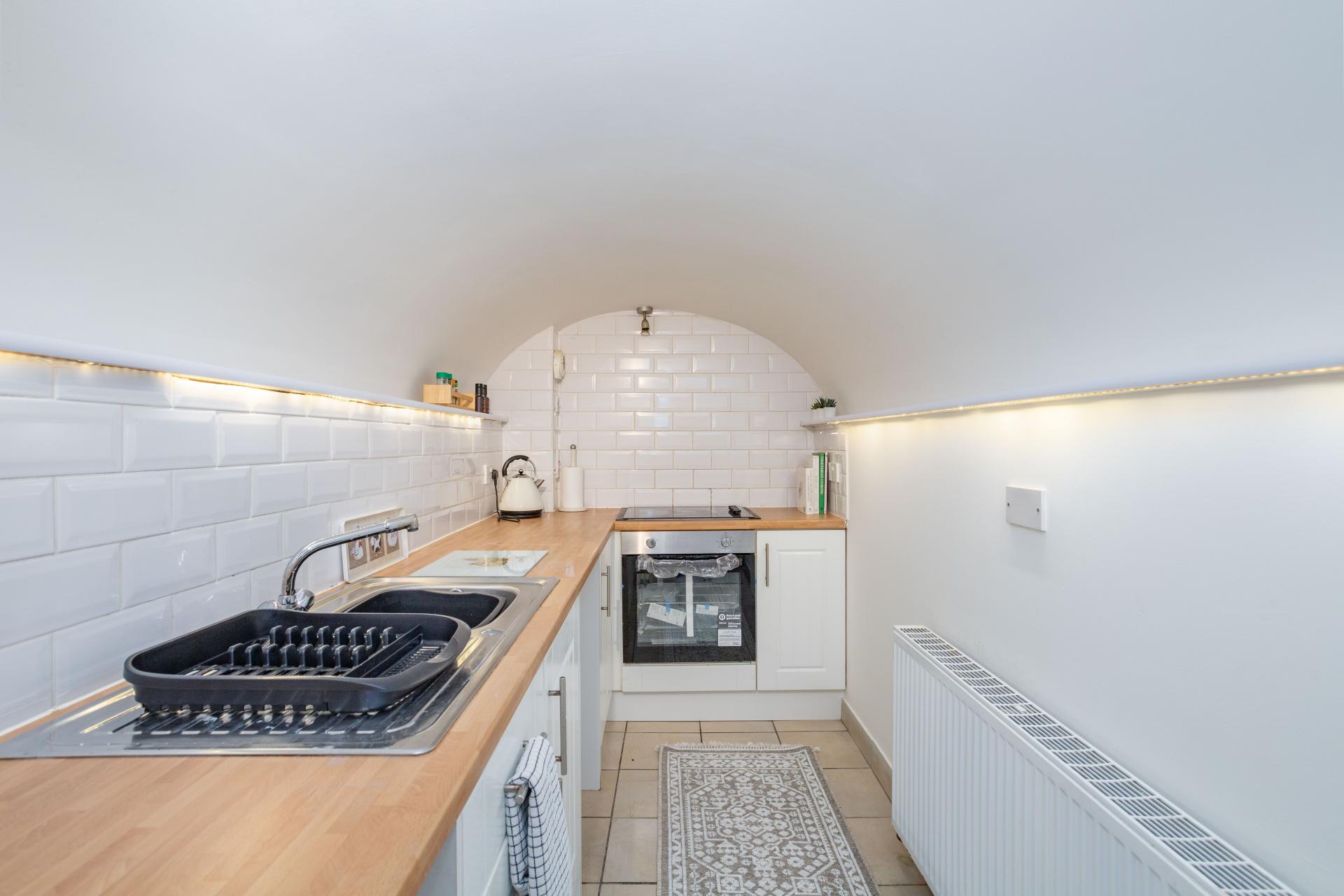 Stairs take you down into the modern fitted kitchen with a vaulted ceiling and new electric oven and hob. There is space for an under counter fridge and plumbing for a washing machine.