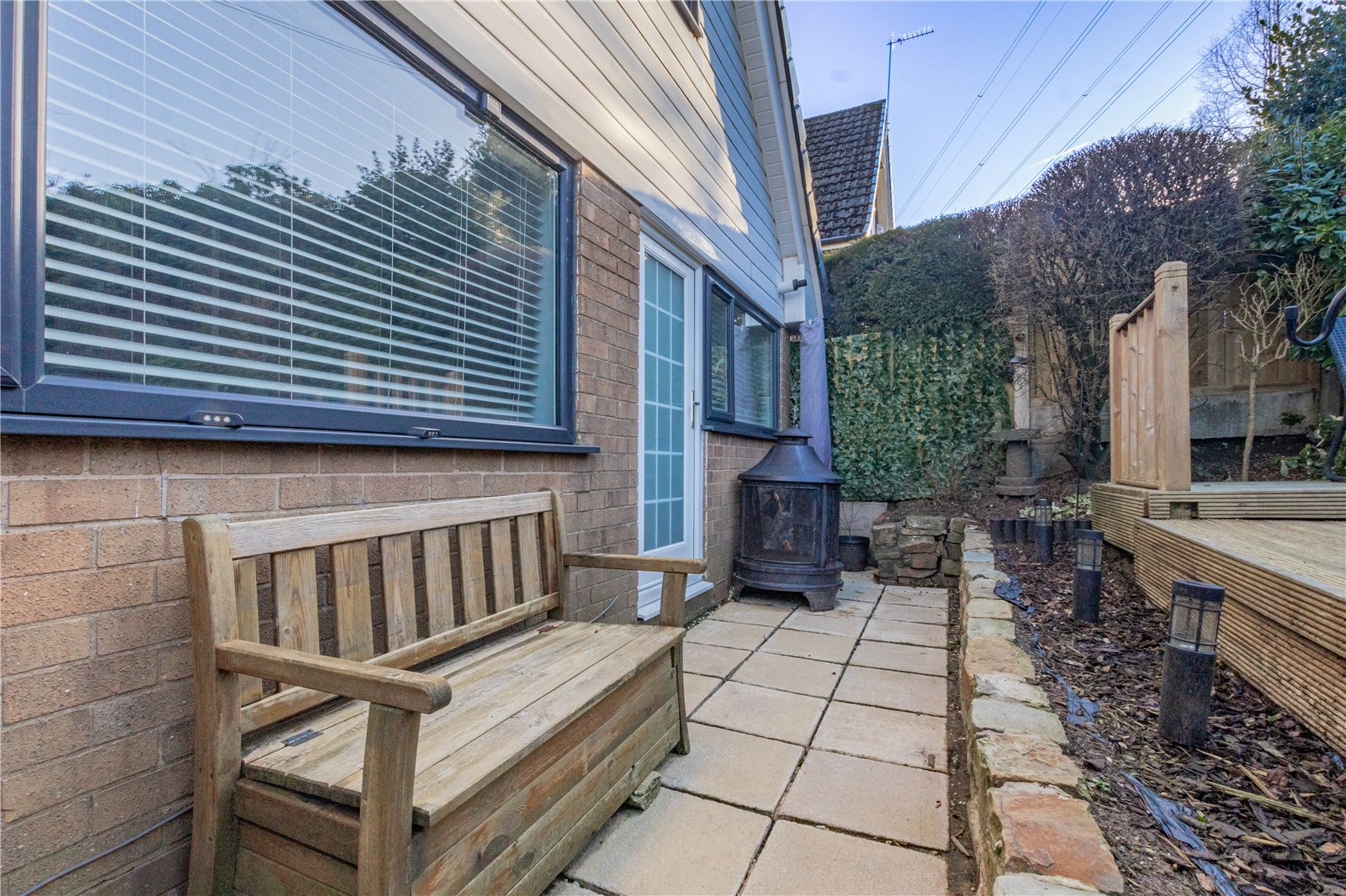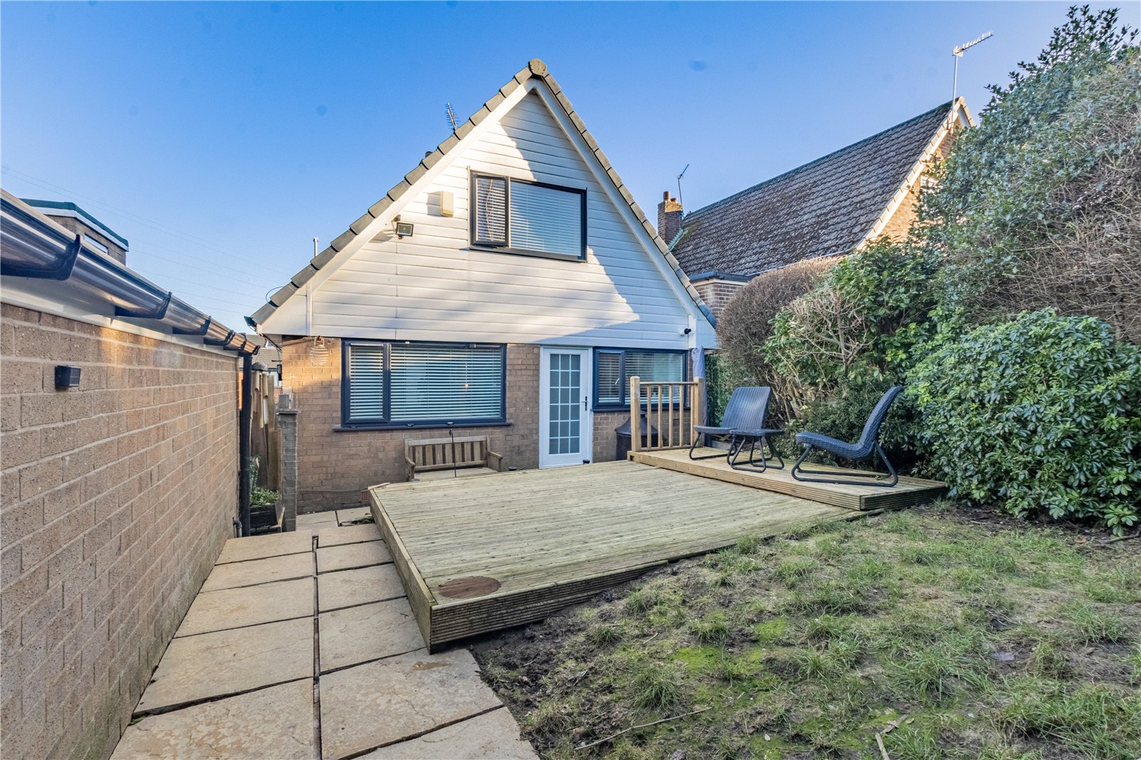 Externally the property stands in an ELEVATED position on a good sized plot, providing AMPLE OFF ROAD PARKING with driveway leading to GARAGE. To the rear reveals an ATTRACTIVE SOUTH WEST FACING lawned garden with decked seating area.