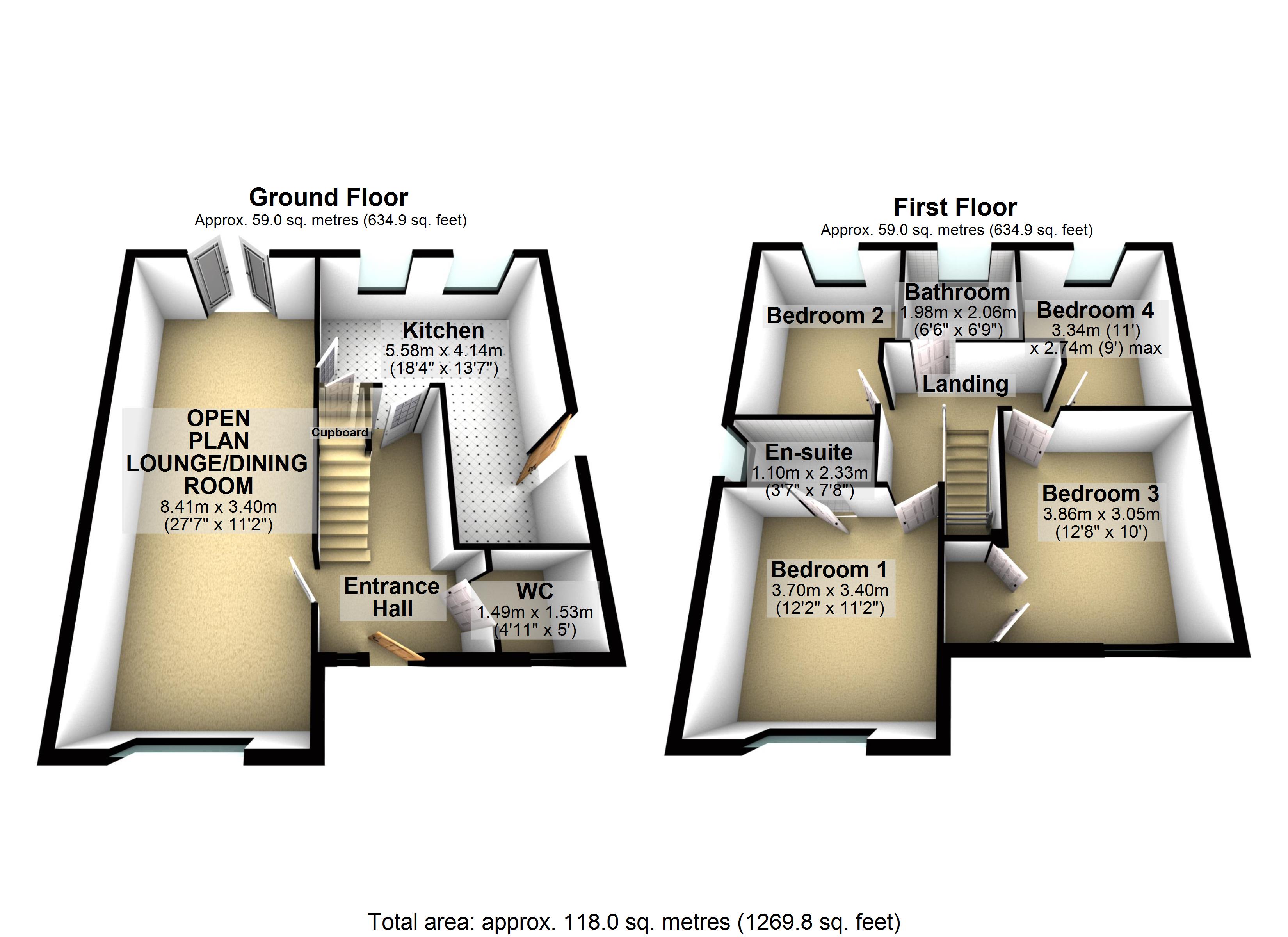 Internally the accommodation covers approximately 1270sqft of living space and boasts BESPOKE QUALITY FIXTURES AND FITTINGS installed throughout, comprising of entrance hallways, OPEN PLAN LIVING/DINING ROOM with REMOTE CONTROLLED GAS LIVING FLAME FEATURE FIRE, STUNNING MODERN FITTED KITCHEN with TOP OF THE RANGE INTEGRATED APPLICANCES, downstairs w.c, FOUR DOUBLE BEDROOMS, en suite and a DELUXE FAMILY BATHROOM SUITE.