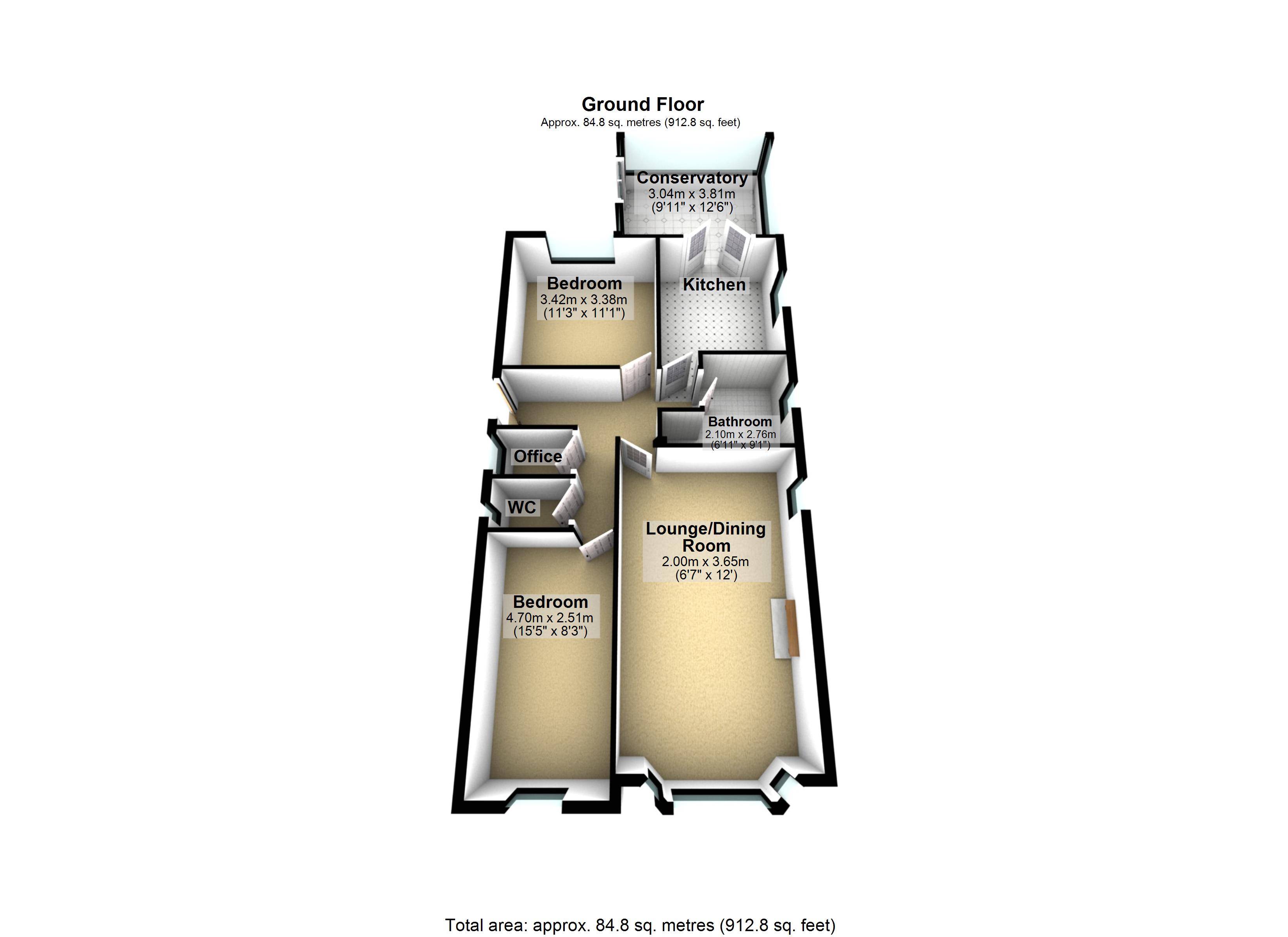 Internally the accommodation covers approximately just over 910sqft of living space, comprising of entrance hall, OPEN PLAN LIVING/DINING ROOM, two bedrooms, office, w.c, family shower room, kitchen and conservatory.