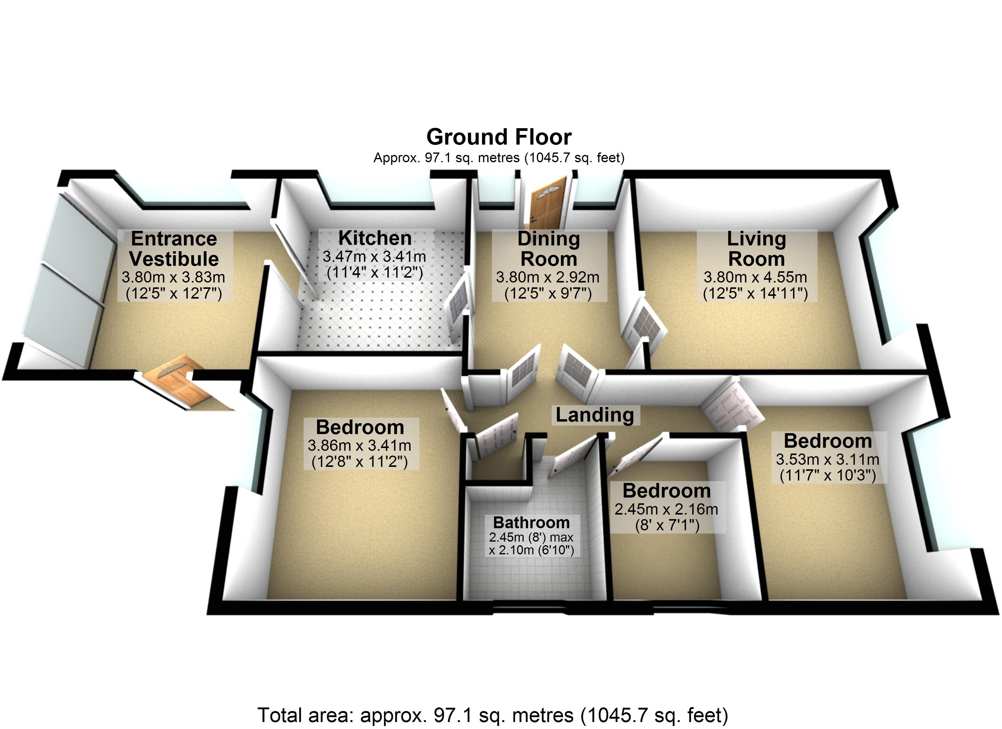 Internally the accommodation covers approximately 1045sqft of living space, comprising of entrance vestibule, lounge, kitchen, dining room, THREE BEDROOMS and WET ROOM.