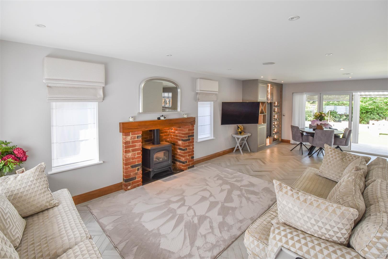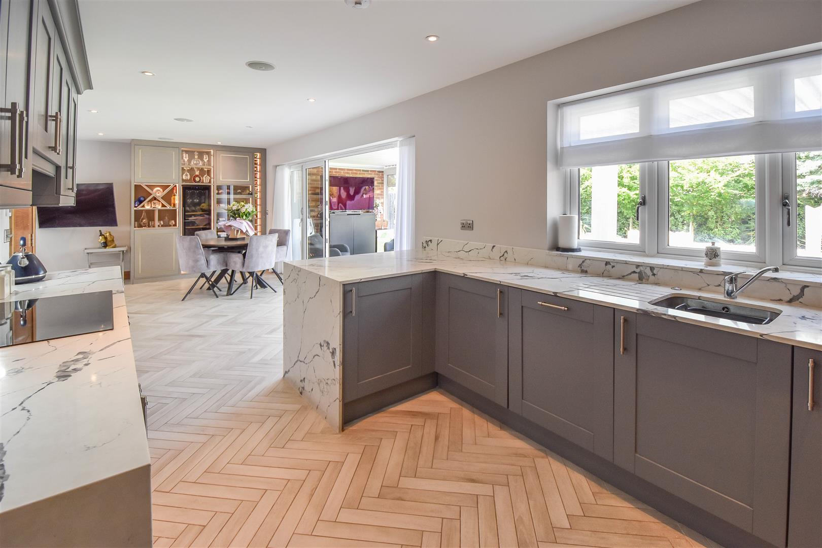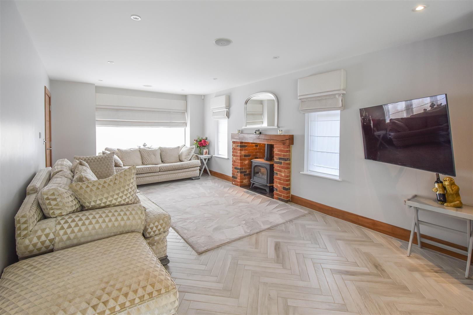 A central porch with double storage cupboard opens into a spacious hallway with attractive herringbone style parquet flooring which continues into the open plan living areas and cloakroom, with oak doors to all main rooms and stairs which rise to the first-floor level. A spacious study located at the front of the property offers applicants looking to work from home a quiet space away from the main living areas. There is a modern ground floor cloakroom with space saver basin and w.c. with hidden cistern. The remaining ground floor accommodation comprises of a lovely open plan set up with a relaxing living room with a red-brick fireplace and log burning stove as a lovely focal point. The lounge opens to a spacious dining area with bi-folding doors onto a fabulous, covered patio. For wine enthusiasts there is a large built-in wine chiller with glass storage cabinets and shelving. The dining room leads into a stylish kitchen with luxury 'Shaker' style wall and base units with downlighters and quartz work surface over. Integrated appliances include double oven, induction hob with extractor above, dishwasher, microwave and fridge freezer. There is further space for additional appliances in a separate utility room off the kitchen, which has been fitted with units and work surface to match those of the kitchen. There is underfloor heating throughout the ground floor and heating via radiators throughout the first and second floor levels. There is also a speaker system throughout the property.