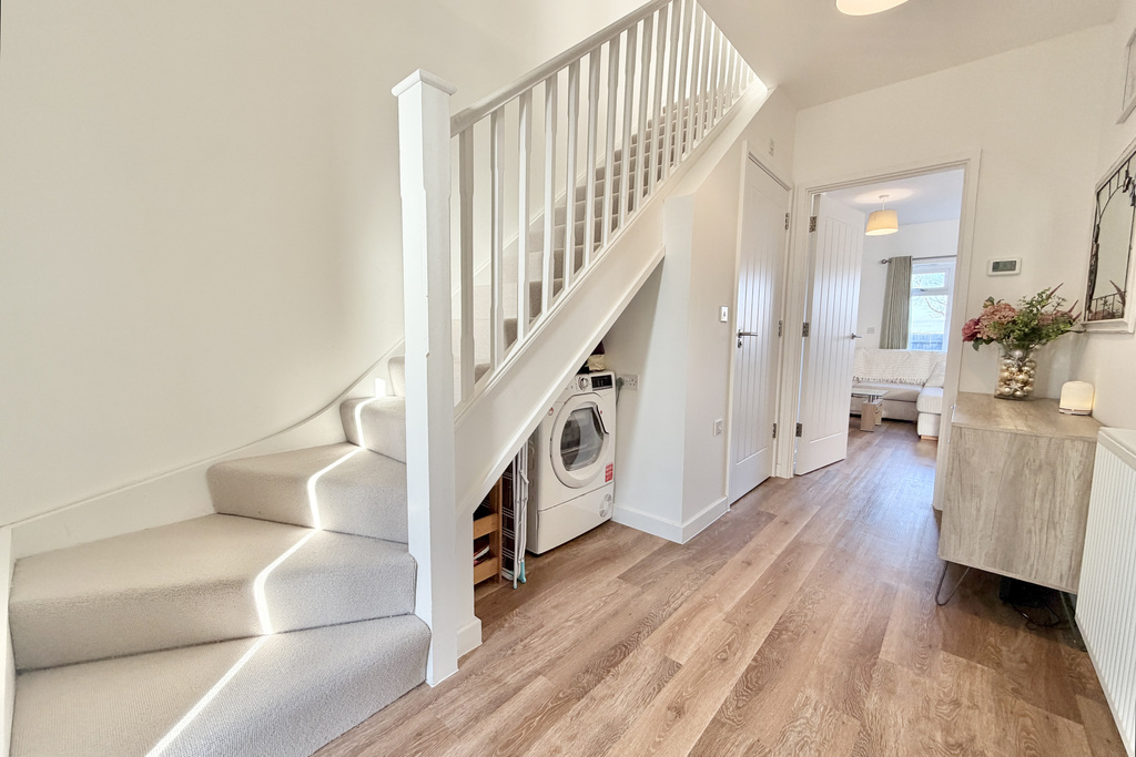 with wood effect LVT flooring, high security front door with double glazed panel to side, understairs storage with space for tumble dryer, radiator