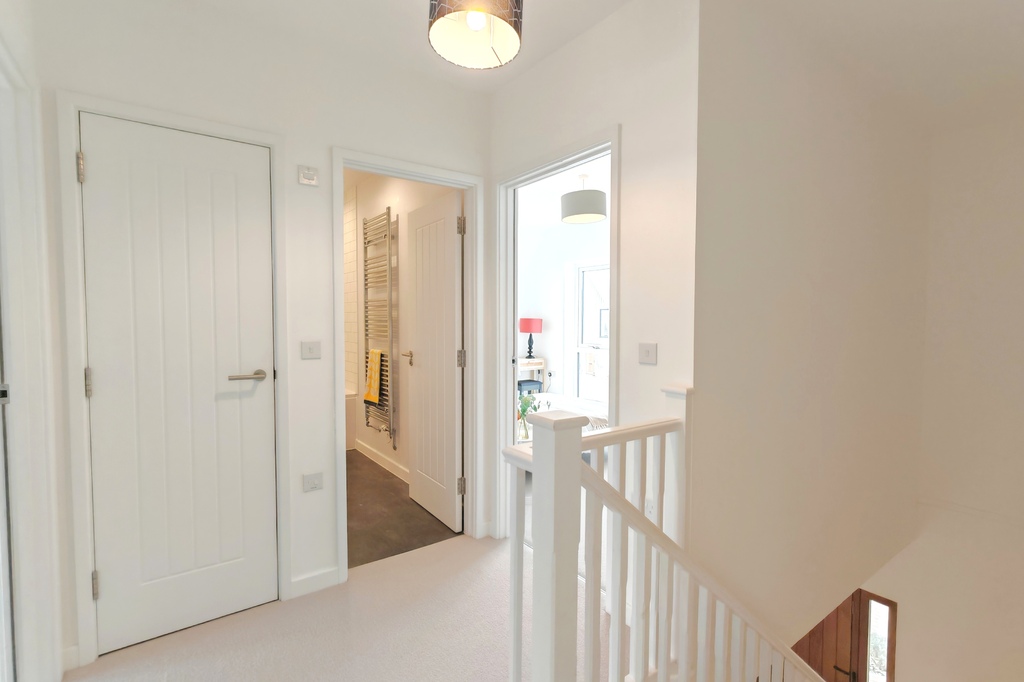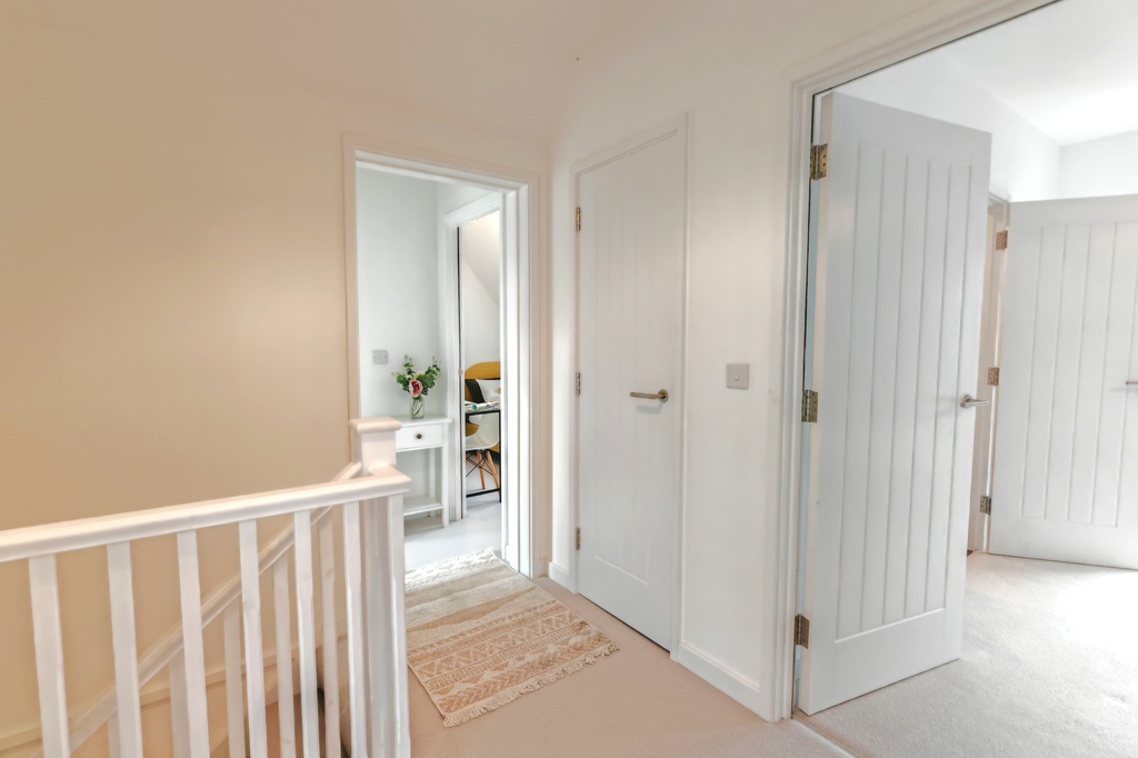 On the first floor, the landing grants access to two cupboards and a loft hatch for additional storage. The first bedroom is bright and inviting, featuring a radiator and uPVC double-glazed doors leading to a Juliet balcony overlooking the rear. The en-suite bathroom includes tile-effect Karndean flooring, a wall-hung WC with a concealed cistern, and a stainless steel towel radiator, along with a hand basin and a shower cubicle equipped with a rainfall shower and separate hand attachment, complemented by localised tiling.
